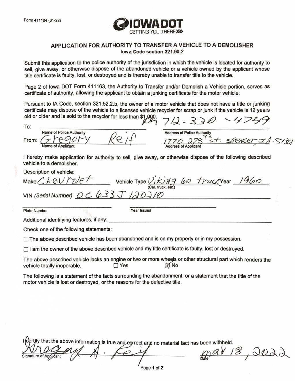 Vehicle Tracking Number:60CH019