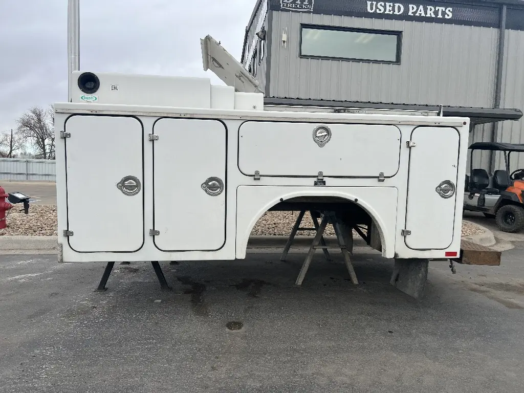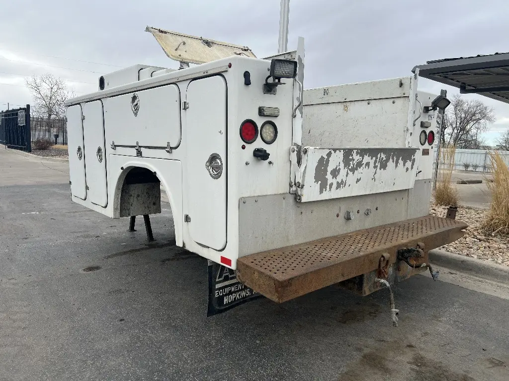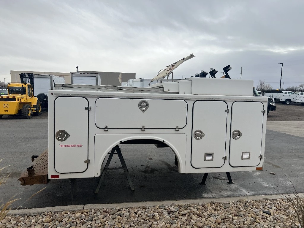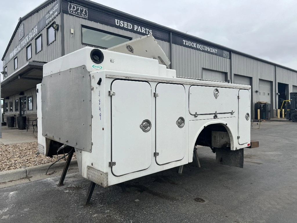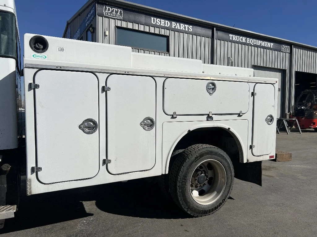 11'L 95"W 48"T Brandfx Service body, Made From Fiber glass, 8 compartments, Slide locking tonneau cover, 84’”Cab to axle fitment. Vented storage compartment, Lube storage Tank. Call DTI Trucks for more information and a shipping quote.