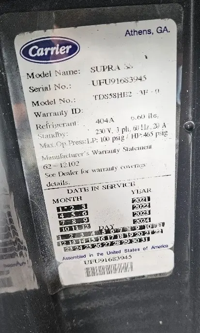 GOOD USED CARRIER REFER UNIT SUPRA S8 6579 HRS , HAS ELECTRIC STAND BY MODEL TDS58HB2 , SER # UFU91683945