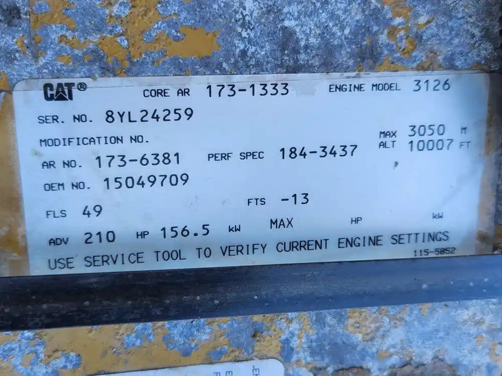 (Used) 1999 Caterpillar 3126, ENGINE ASSEMBLY- Family Number: XCPXH0442HSK, Displacement: 7.2L, Horsepower: 210, Ar. No./CPL: 173-6381, Serial Number: 8YL24259, Part Number: 15049709, E.C.S.: EM, DI, TC, ECM, CAC, Reference images for condition For more information about this item, give us a call. We ship Worldwide! (CRG HEAVY TRUCK PARTS) 929 W PULASKI HWY, ELKTON, MD 21921