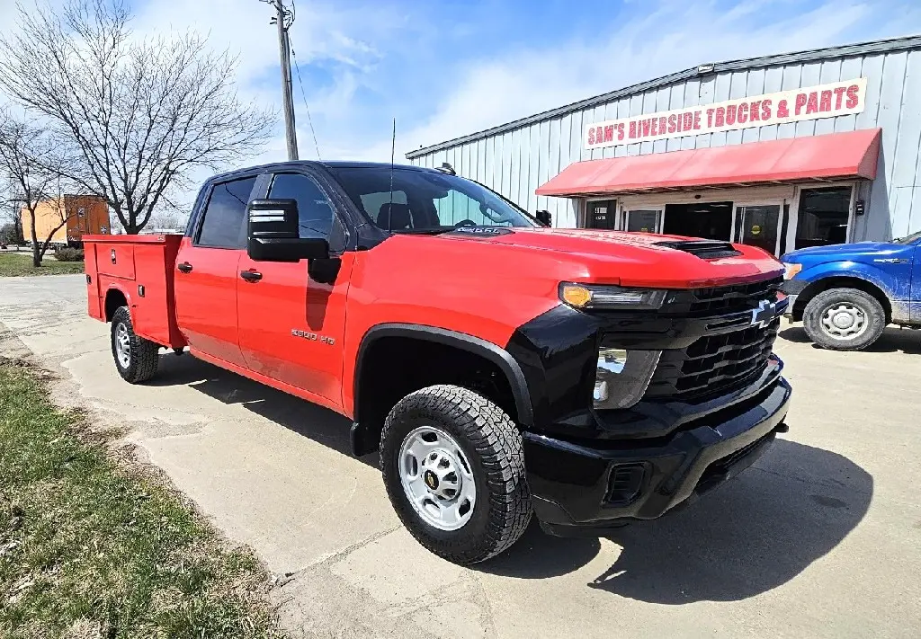 2024 CHEVROLET SILVERADO 2500 CREW CAB WT 2WD , 6.6L V-8 GAS , ALLISON 10 SPEED AUTOMATIC , 3.73 AUTO LOCKING REAR DIFF , REAR VIEW CAMERA , REMOTE KEYLESS ENTRY WITH PUSH BUTTON START , POWER WINDOWS , LOCKS AND MIRRORS , 10,300 GVW , KAPHEIDE 8 FT SERVICE BODY , REBUILT TITLE , ONLY 44,874 MILES