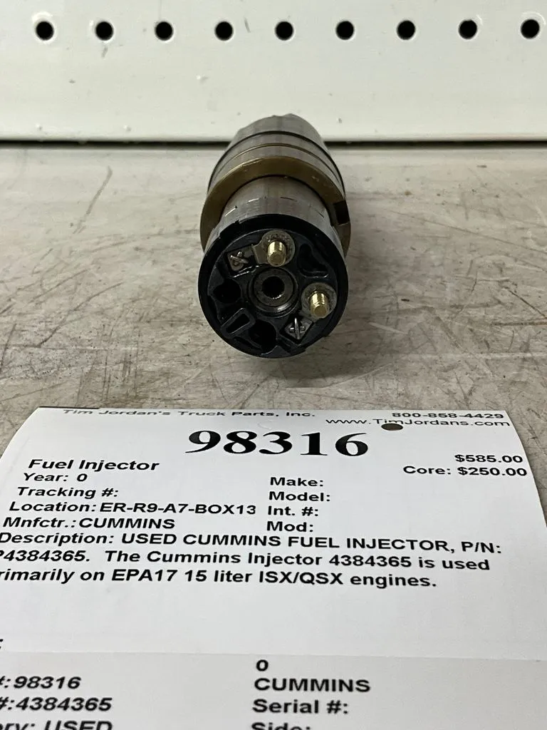 USED: USED USED CUMMINS FUEL INJECTOR, P/N: P4384365. The Cummins Injector 4384365 is used primarily on EPA17 15 liter ISX/QSX engines.