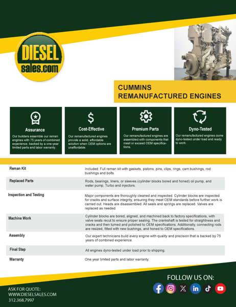 Rebuilt: Rebuilt Engine 4BT PREMIUM REMANUFACTURED CUMMINS 4BT3.9 COMPLETE DIESEL ENGINE STARTING AT $11,995.00 EXCHANGE WITH ONE YEAR OR 2,000 hrs. whichever occurs first, Limited Parts & Labor WARRANTY. Plus $2,000 refundable core deposit, OFF ROAD APPL.