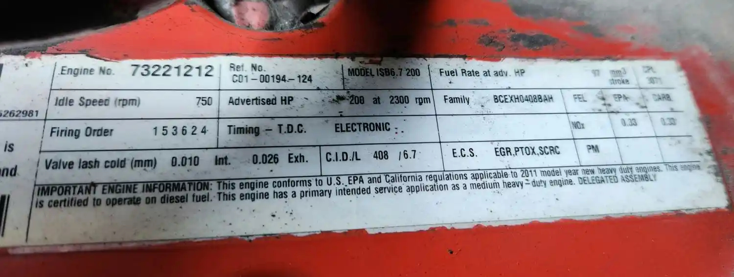 (Used) 2011 Cummins ISB 6.7, ENGINE ASSEMBLY- Family Number: BCEXH0408BAH, Displacement: 6.7L, Horsepower: 200, Ar.No./CPL: 3071, ESN: 73221212, Part Number: C01-00194-124, ECS: EGR, PTOX, SCRC, Reference images for condition For more information about this item, give us a call. We ship Worldwide! (CRG HEAVY TRUCK PARTS) 929 W PULASKI HWY ELKTON, MD 21921