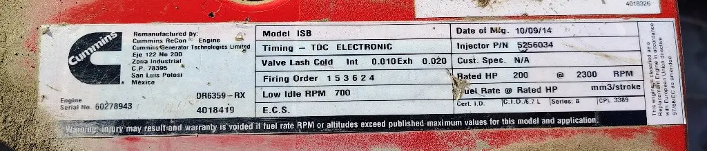 Used: Used ISB, 6.7L, CM2150; 200 HP; S/N 60278943; CPL 3389; DOM 2014