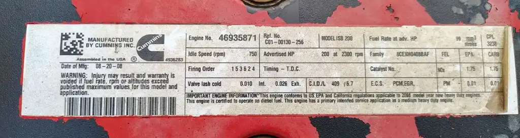 USED: USED ISB, 6.7L, CM2150, 200 HP, S/N 46935871, CPL 3238, DOM 2008