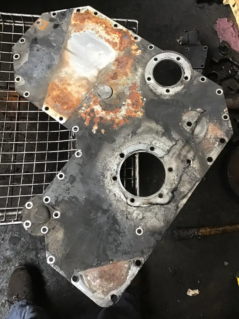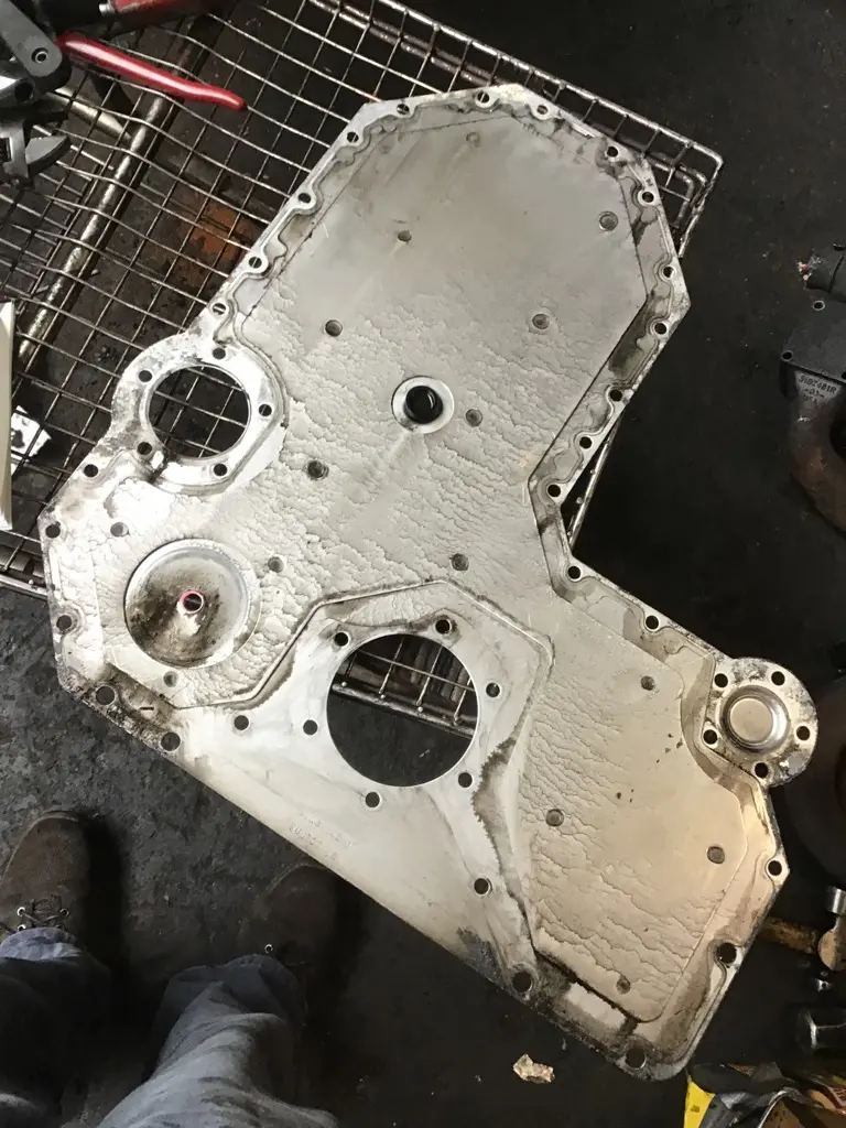 USED: USED (FRONT TIMING COVER) PLATE, ISM 410, CUM, P/N 3400811