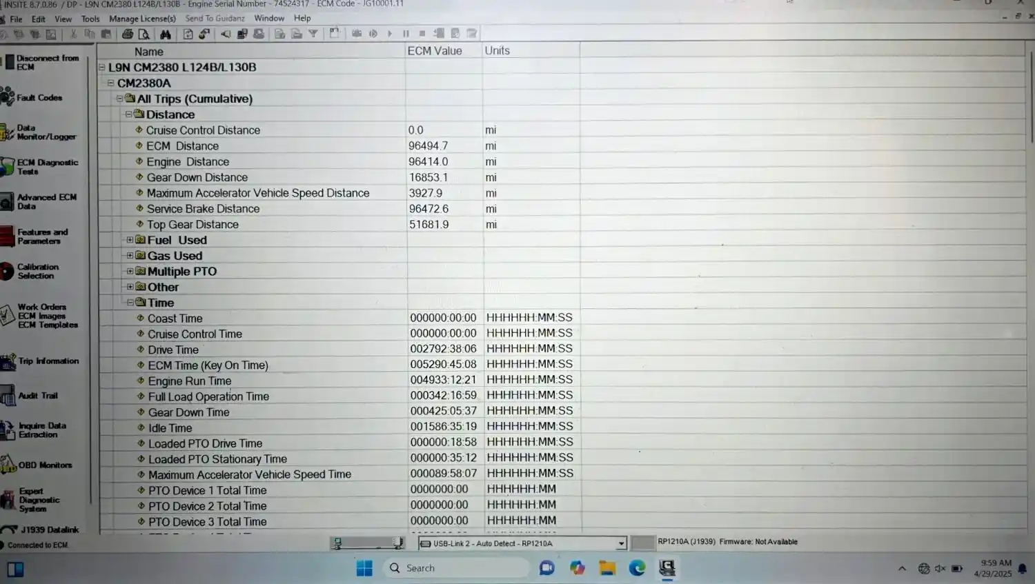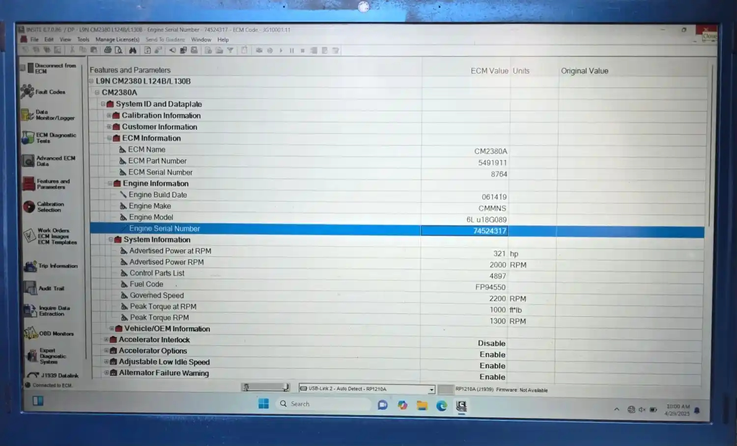 Used: Used L9N LNG Engine, 320 HP, S/N 74524317, CPL-4897, CM2380. Running Engine, signs of possible water contamination. 343,995.2 Odometer Miles 96,414 ECM Miles 4,933:12:21 Engine Hours