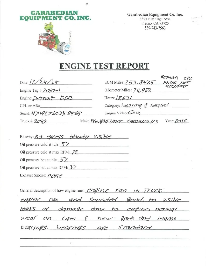 BEARING/SEALED: BEARING/SEALED DD13 EPA10 GHG14, 410 HP, S/N 471927S0358968, 711,952 Odometer Miles. Engine Complete & Runs Good. (See Video Of Engine Running And Test Report)