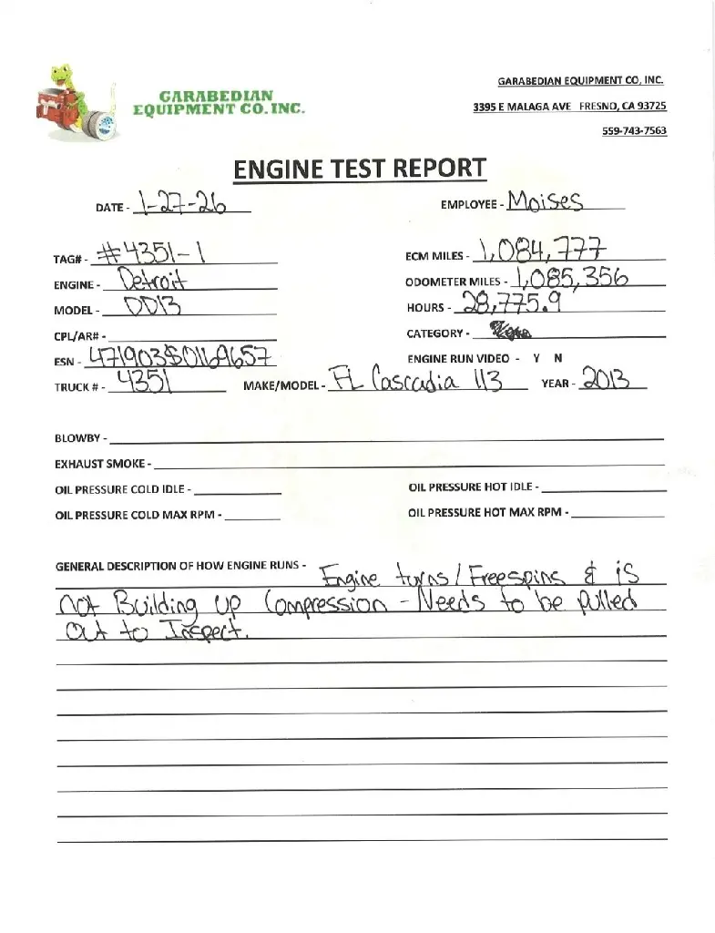 USED: USED Detroit DD13 EPA10, 410 HP, S/N- 471903S0169657, 1,085,356 ODO Miles, 1,084,777 ECM Miles, 28,775.9 Hours. Engine turns 360 but does not run. DISCOUNTED AND AS IS