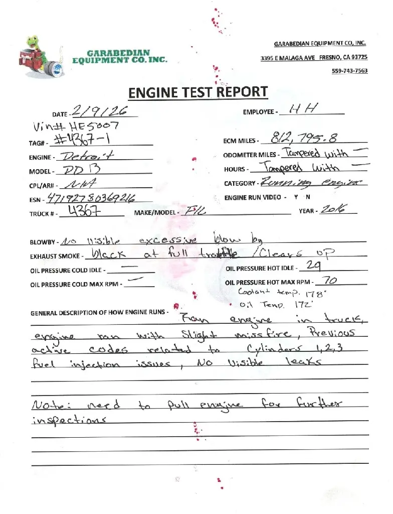 USED: USED Detroit DD13 EPA10 GHG14, 410 HP, S/N- 471927S0369216, 812,795.8 ECM Miles. Engine runs with slight misfire. Previous active engine codes & possible fuel injection issues. (Please see video of engine running and test report). DISCOUNTED AND SOLD AS IS