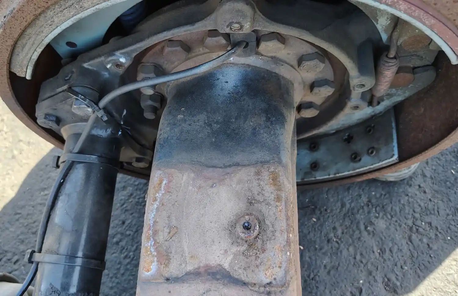 Used: Used Spicer Rear Axle Housing, 17060S, 10 Hole Pilot, Air Drum Brakes, ABS, 53.5" Inner Flange To Inner Flange, STD Track. P/N 323668 (Replaced By 10046910). Removed From International Corporate Spring Suspension, HOUSING ONLY, DIFF SOLD SEPARATELY