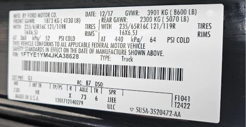 | VIN #: | 1FTYE1YM4JKA38628 |