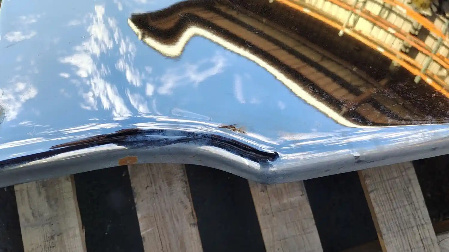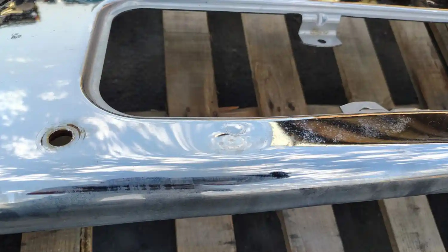 Used: Used Freightliner Coronado Chrome Plated Steel Bumper, 17"W, P/N A21-26661-001. Has A Few Small Knicks In The Chrome, Small Dent On Upper Center Area