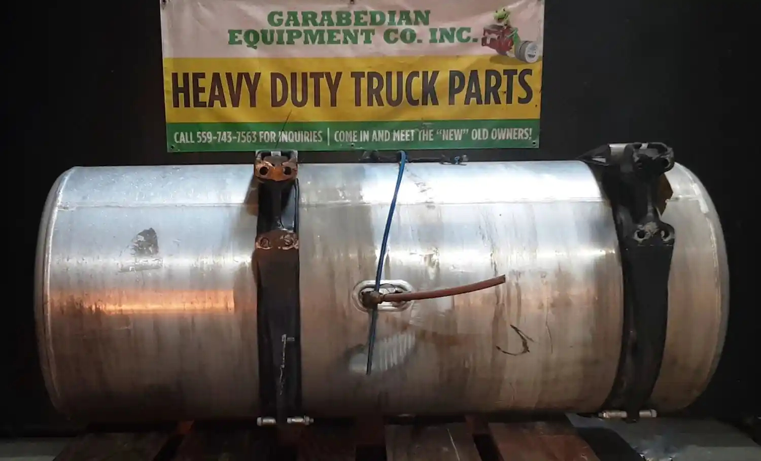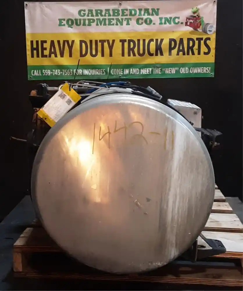 USED: USED Driver Side Fuel Tank, 58"L x 25" Dia, P/N A03-38623-440, 120 Gallon Capacity, Rear Fill, w/ Straps, Brackets & Steps. Steps Are Dented.