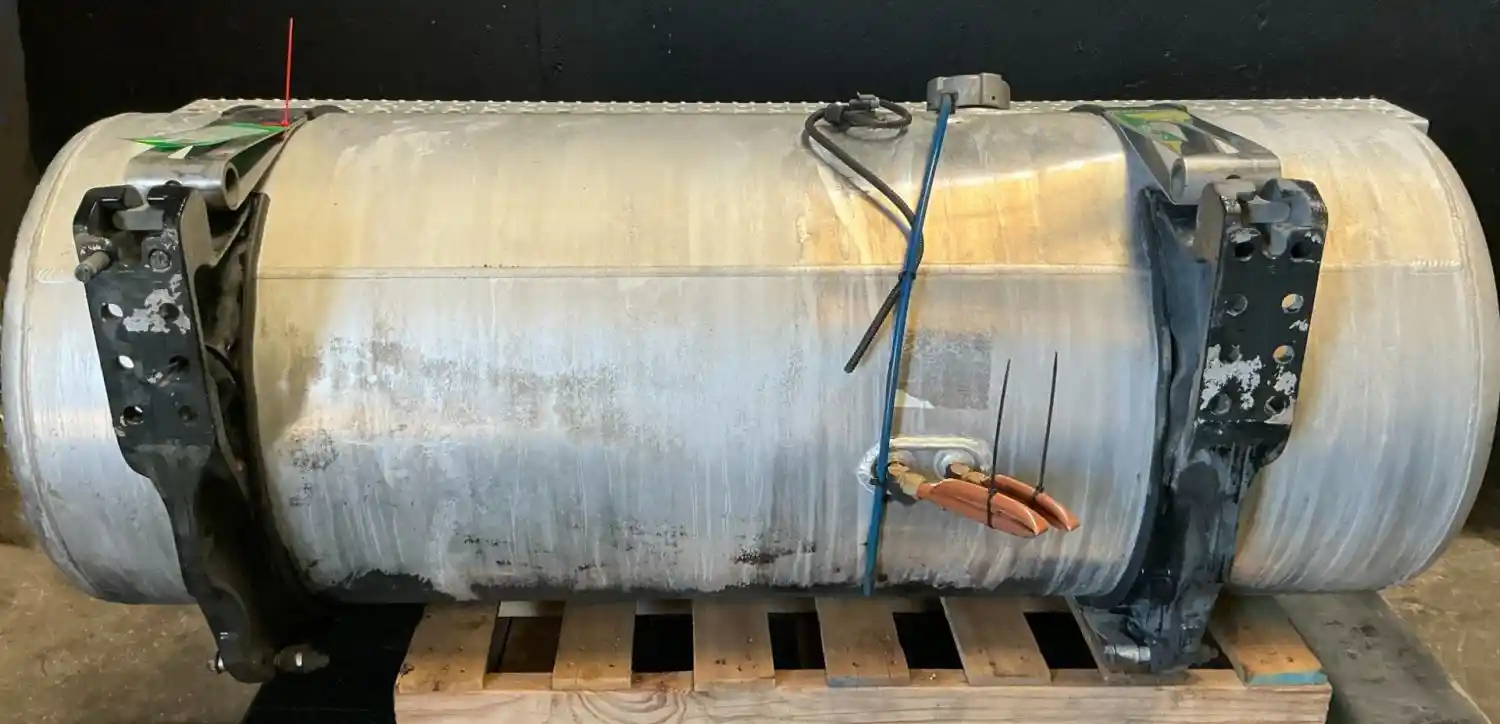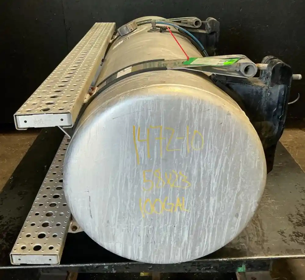 USED: USED Driver Side Fuel Tank, 58"L x 23"Dia, 100 Gallon Capacity, w/ Steps & Brackets. Dent On Backside Under Bracket. P/N A03-36074-180