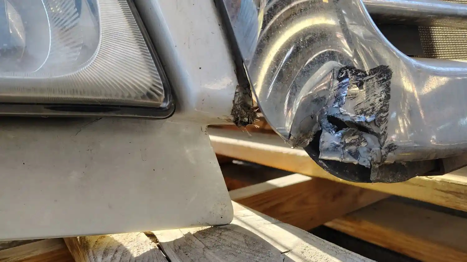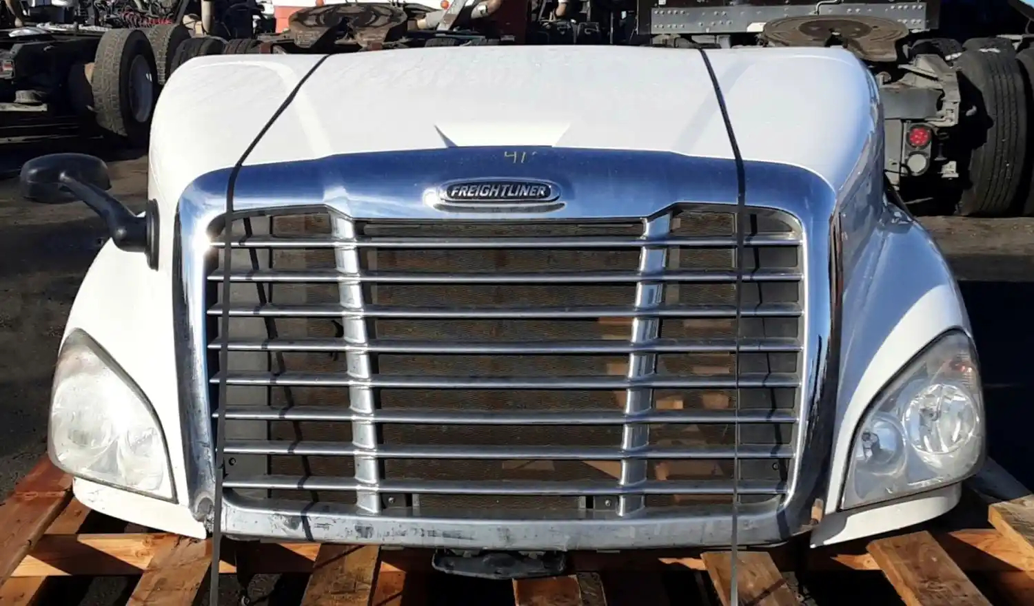 Used: Used 2014 Cascadia 113 Hood, Set Back Axle, 36.5"L, P/N A17-15588-001 (Replaced by A17-15588-010). Grill Damaged On Lower RH Corner, Crack Below RH Headlight, Scrape On RH Headlight. Repairable For Reuse. Includes RH Mirror.