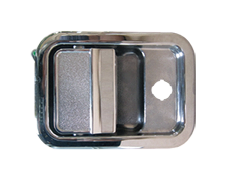 NEW: NEW FREIGHTLINER COLUMBIA PREMIUM OUTSIDE DOOR HANDLE WITH A 2.2 CENTIMETER CYLINDER HOLE, METAL, CHROME FINISH, LEFT HAND.