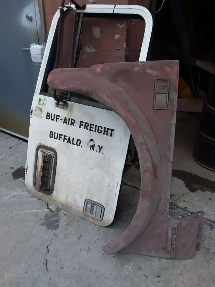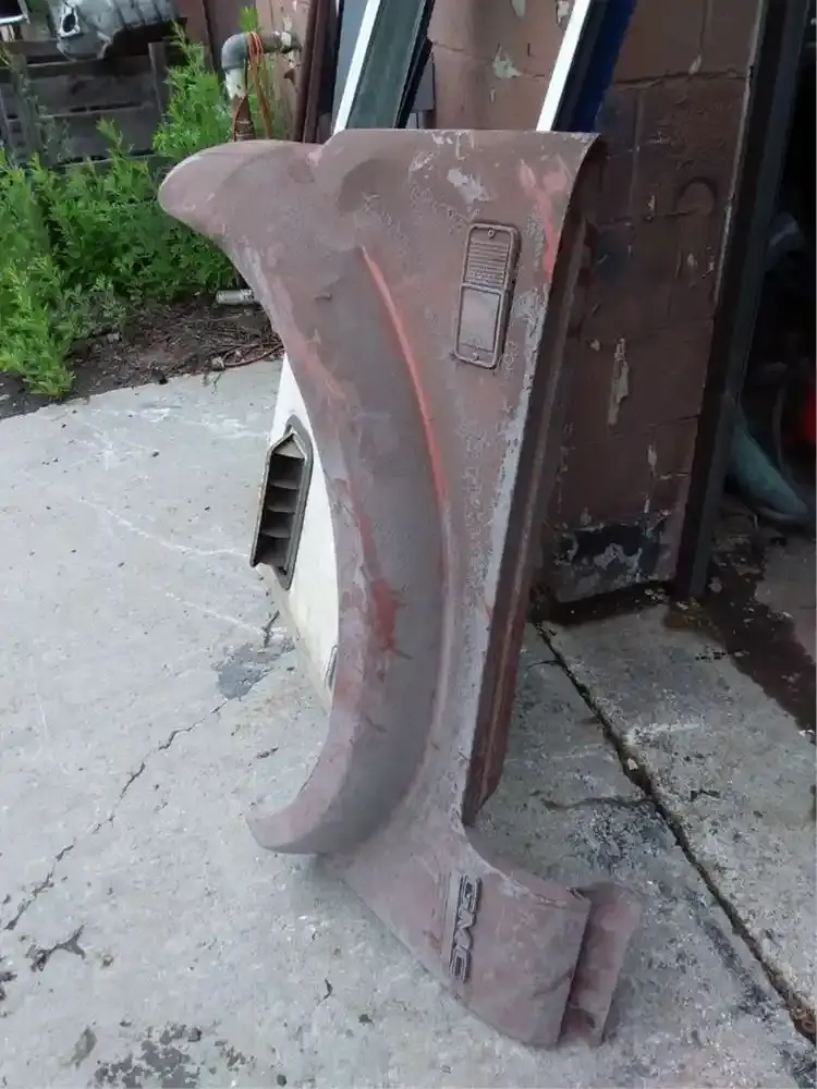 1969 GMC C60 drivers front fender. Been in heated storage in our building since mid 80's. Very dusty with a couple easily straightened dings in wheel well, and has a little rot in rear inner support.. Has GMC EMBLEM STILL ON IT