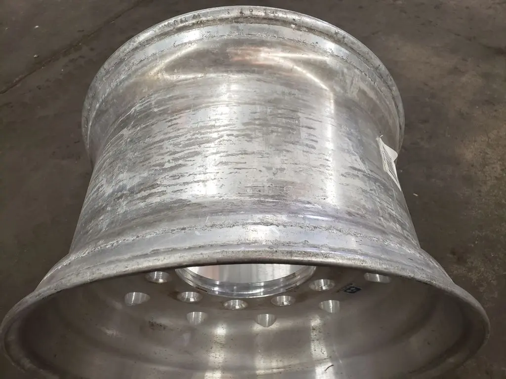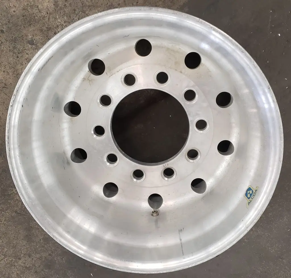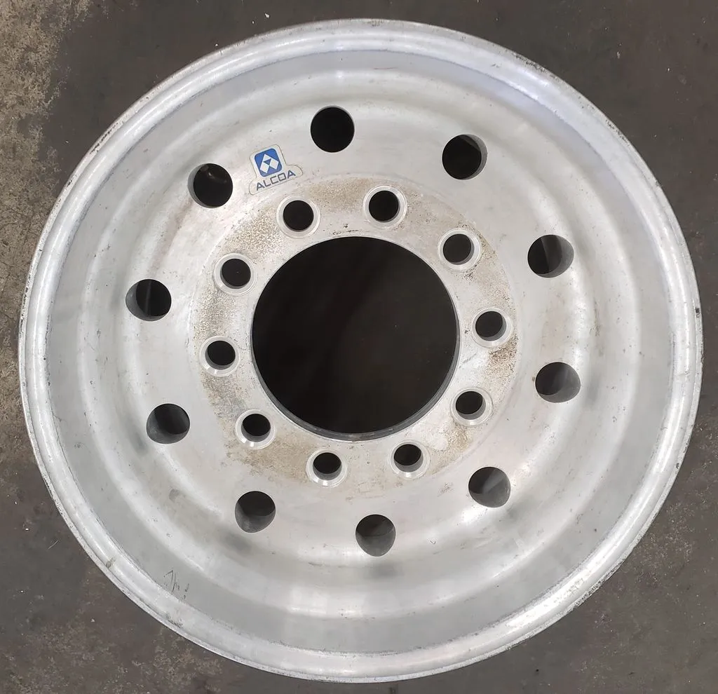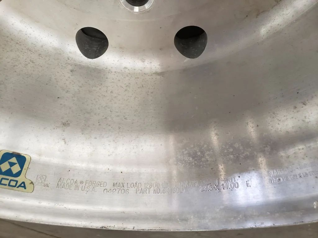 Alcoa brand super single 22.5" x 14" wheel in great used condition. Wheel has 9" offset on one side and 6" offset on other side. BUDD / stud-piloted mounting style.
