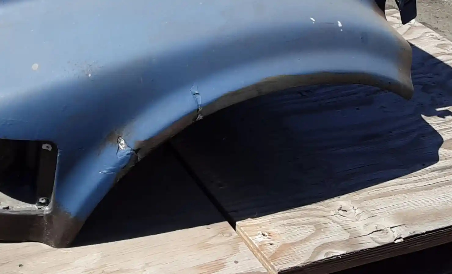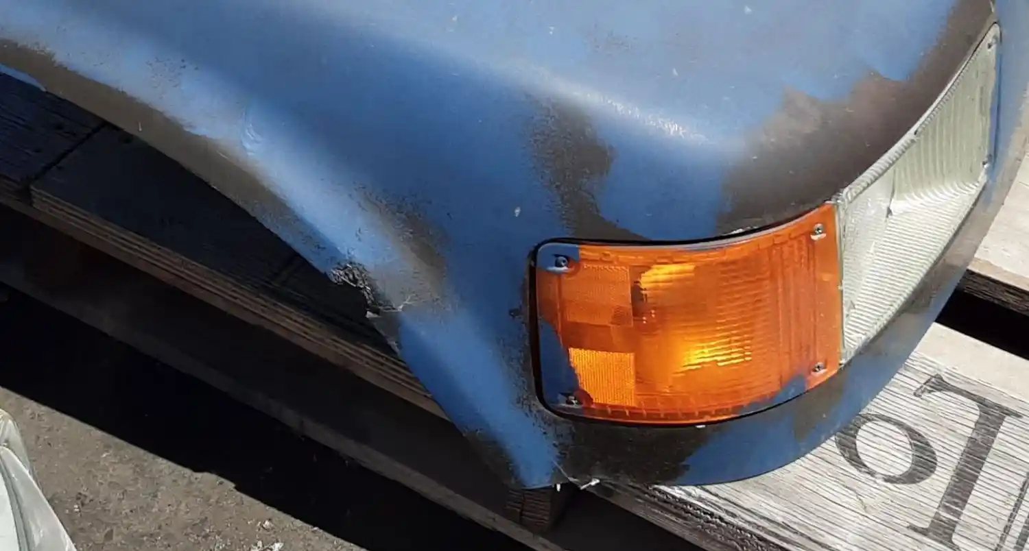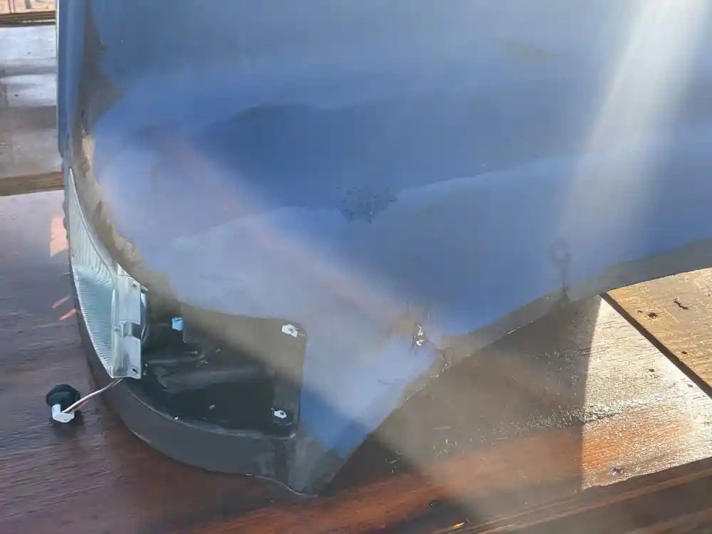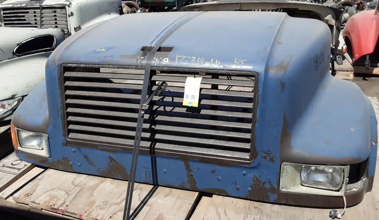 Used: Used 2002 International 4700 Hood for Parts, 44.5"L, Set Back Axle. P/N 2023778C1. Minor Cracks Behind Headlights Along Fenders, Missing Left Blinker Light.
