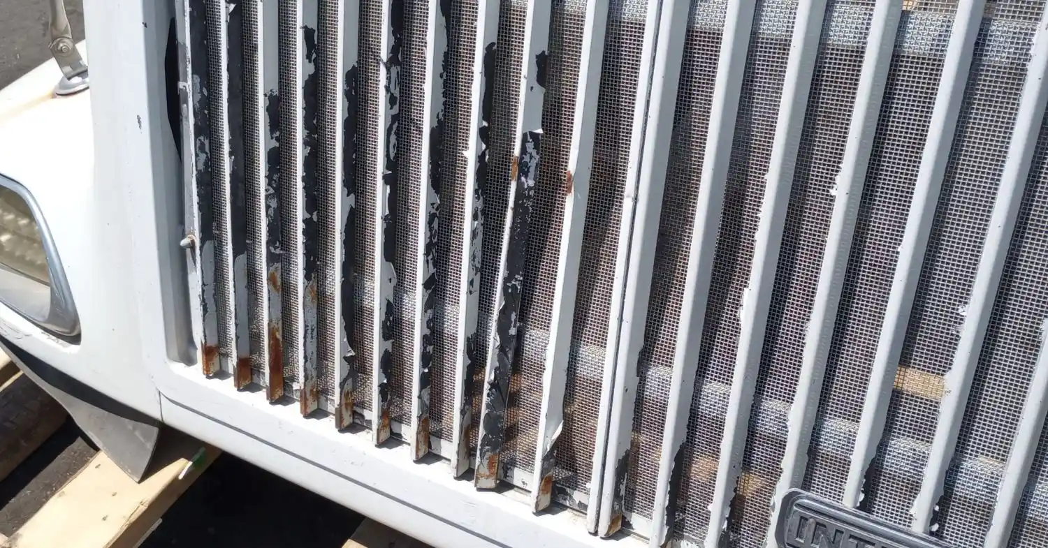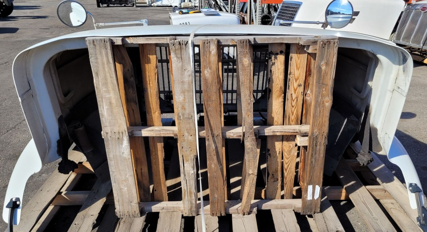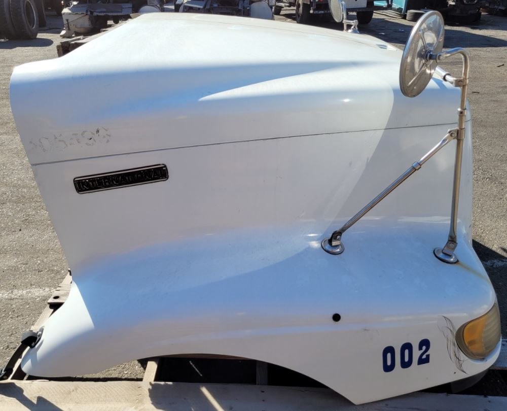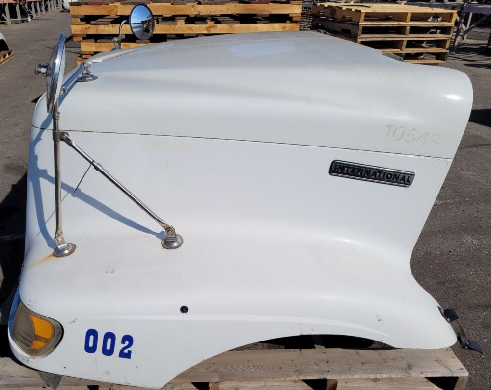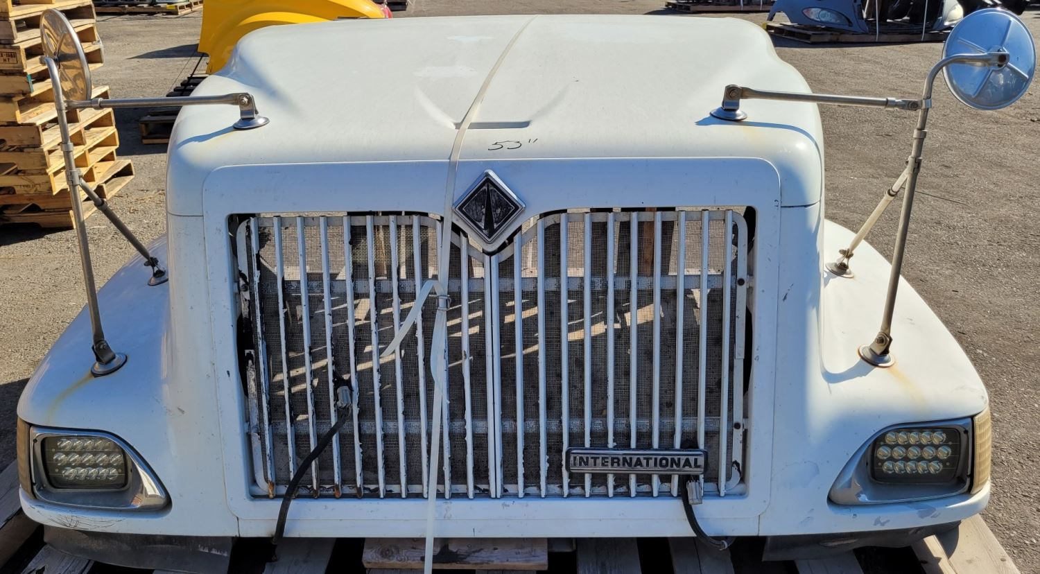 Used: Used 2000 International 9100i Hood, 54"L, Set Back Axle, P/N 3514033C91, 3551824C96. Rust On Grille Ribs, One Rib Broken. Includes Mirrors, Repairable For Reuse.