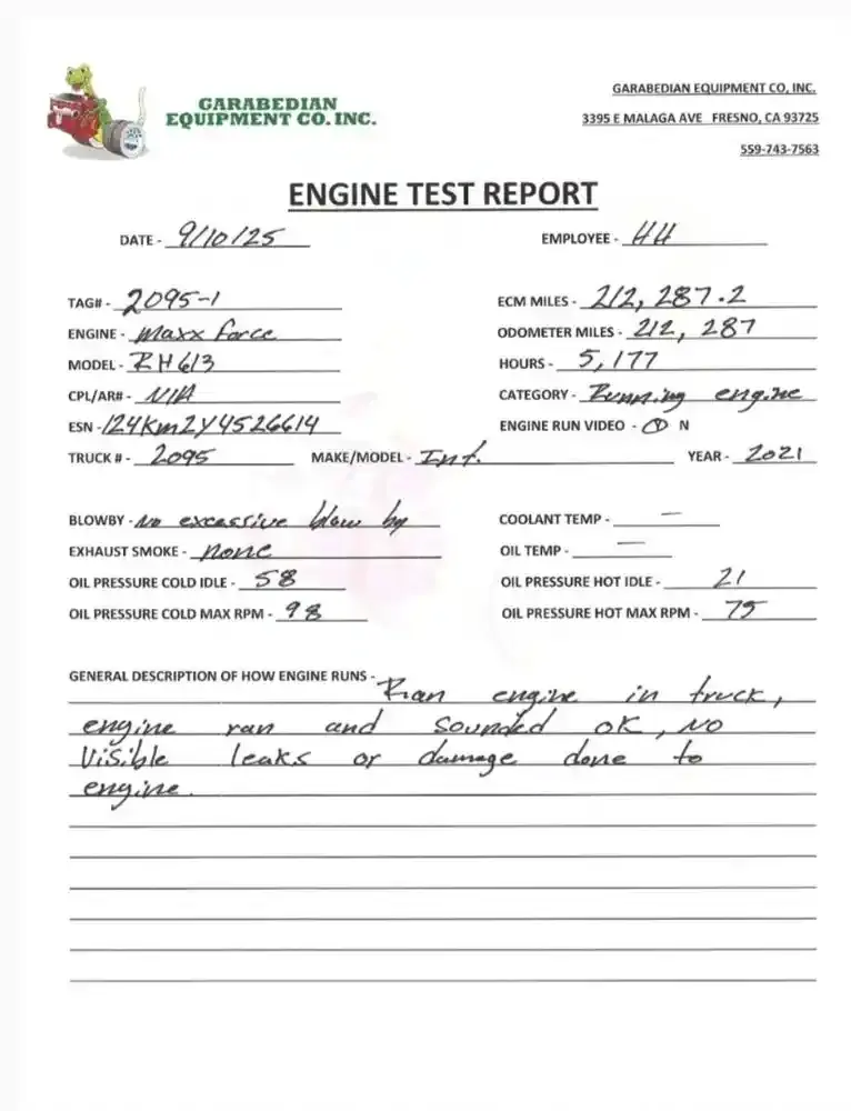 INSPECTED: INSPECTED A26 EPA 20, 430 HP, S/N 124KM2Y4526614, 212,287 Odometer Miles. Engine runs good. (See video of engine running and test report)