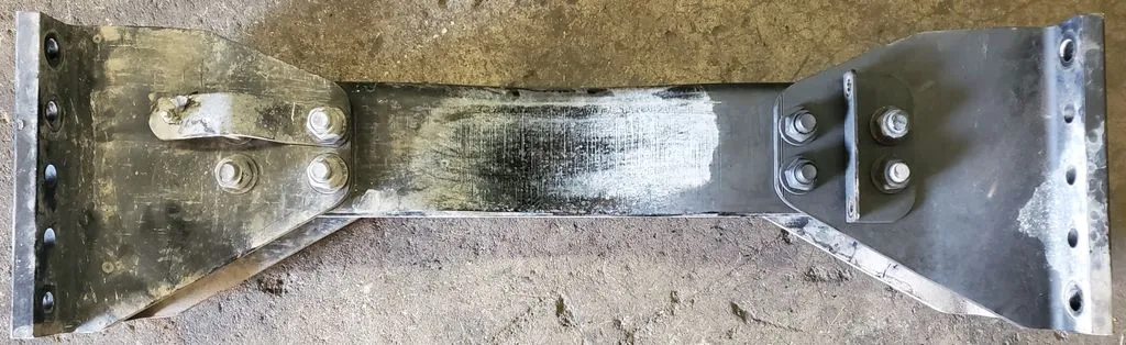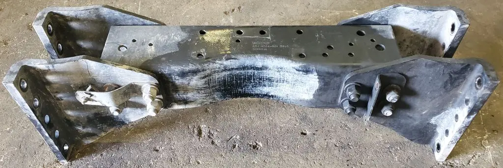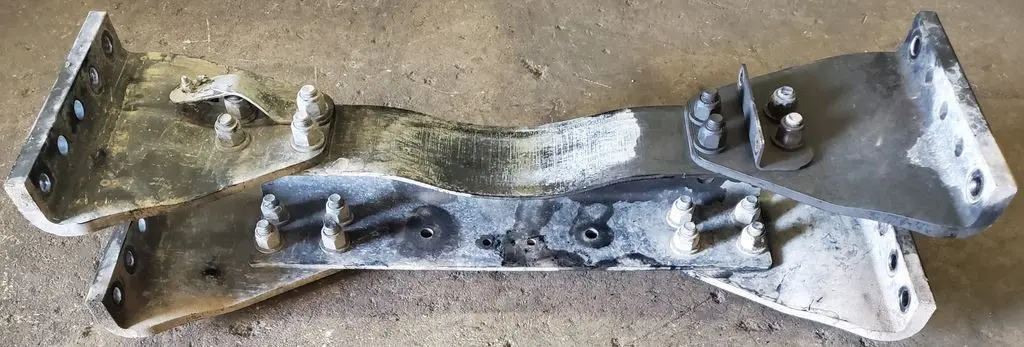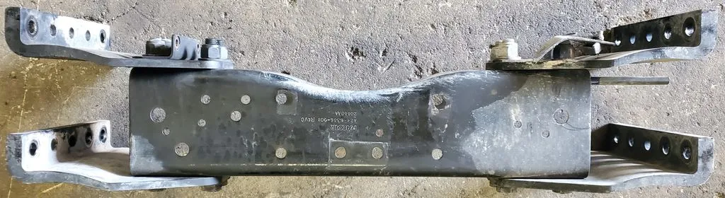 Steel crossmember off of a 2017 Kenworth T680. Crossmember is good used condition with no bends or cracks, see pictures. Comes with both steel gussets. Part measures 33" total end to end, 23" without gussets. OEM P/N A24-6336-002 REV B