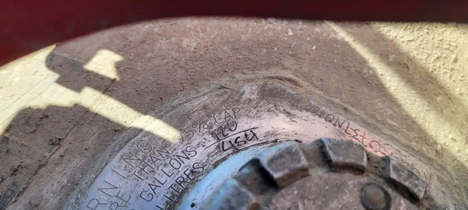 USED: USED Driver Side Fuel Tank, forward fill, 62"L x 24" Dia, 120 Gallon Capacity, Forward Fill.