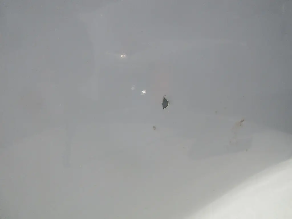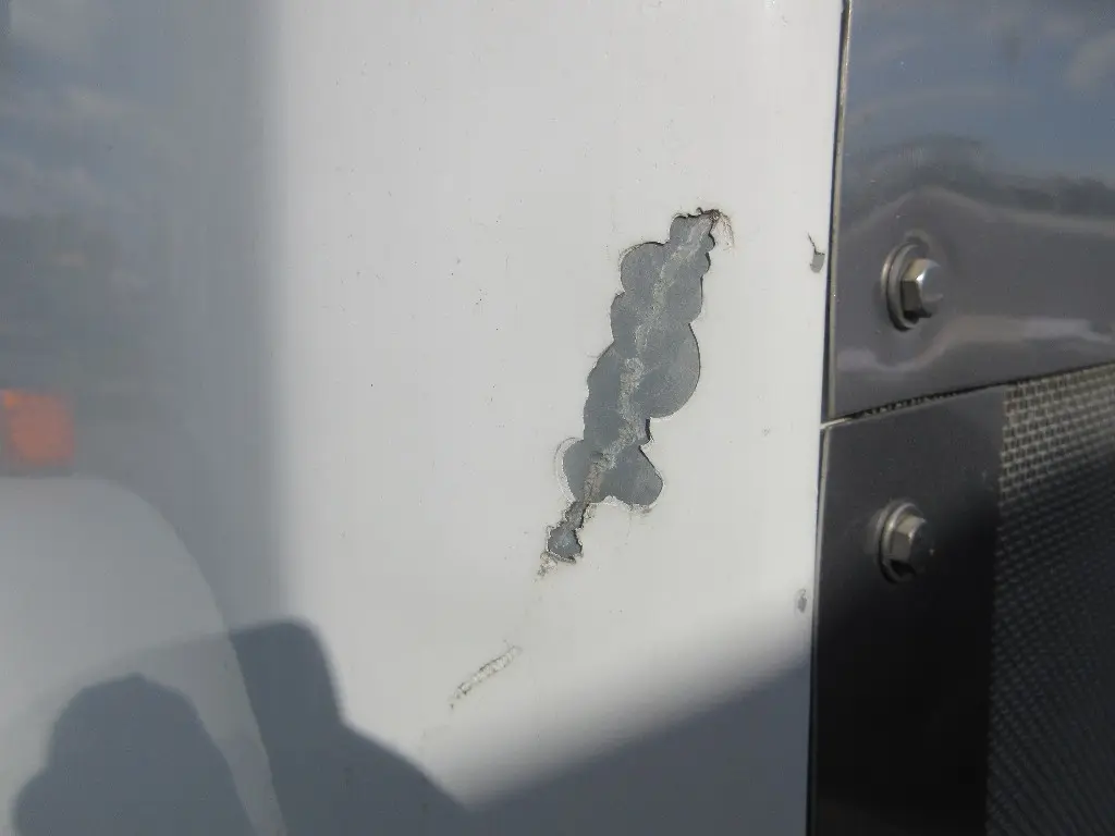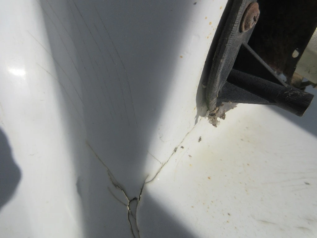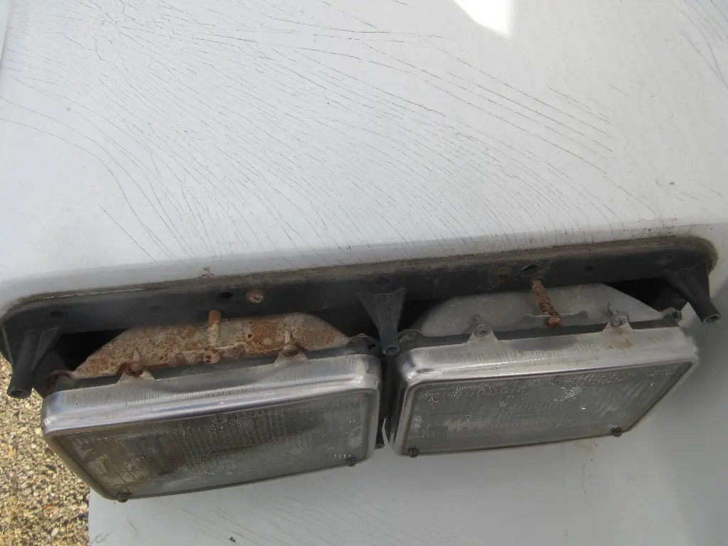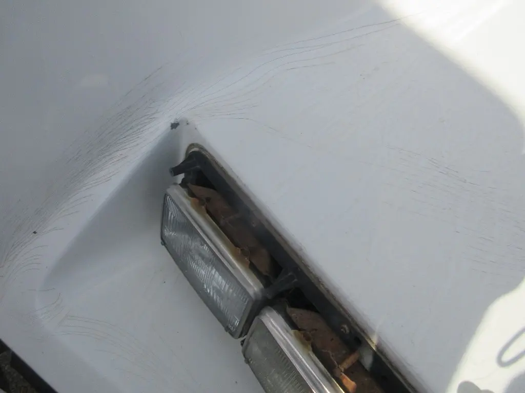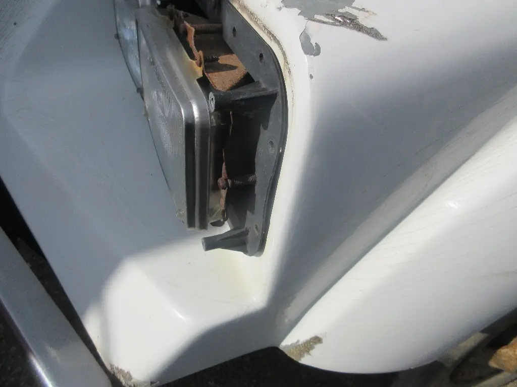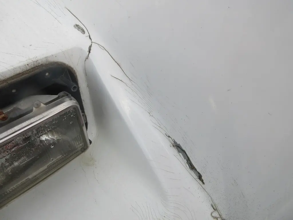 HEADLAMP BEZELS MISSING, PAINT CHIPS & CRACKING, SMALL GOUGES ON LH NEAR HEADLAMP, SMALL CRACK BELOW RH HEADLAMP