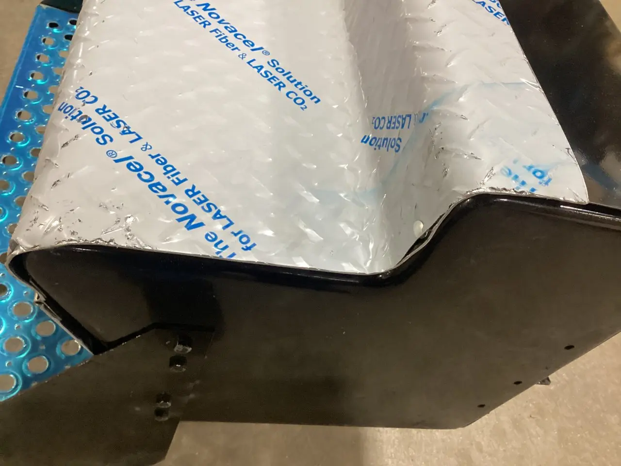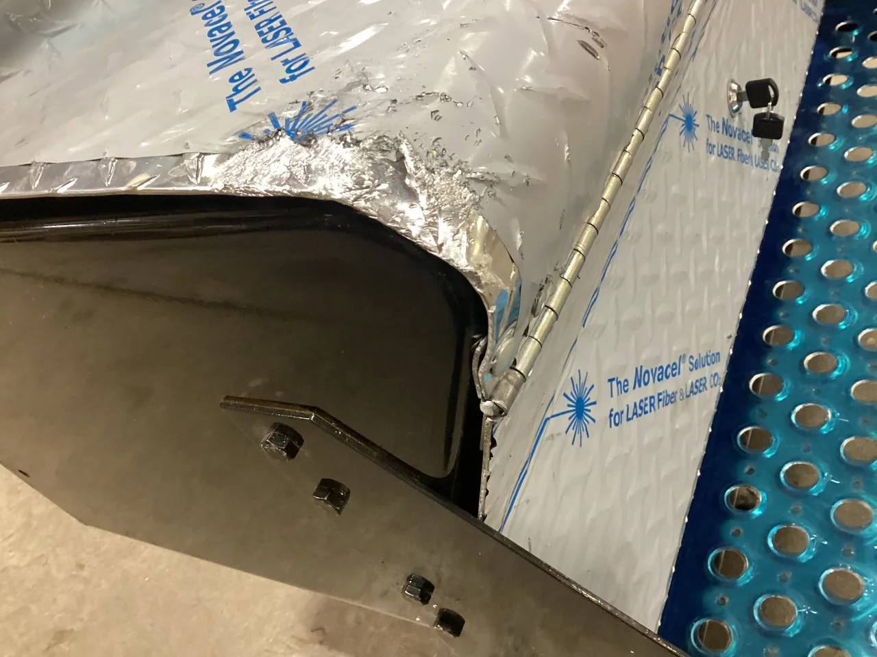 USED: USED DIAMOND PLATE ALUMINUM 34 X 25 X34 INCH PASSENGER SIDE TOOL BOX ASSEMBLY WITH TWIST LATCH, LID DENTED ON BOTH SIDE, LID DOESN'T OPEN