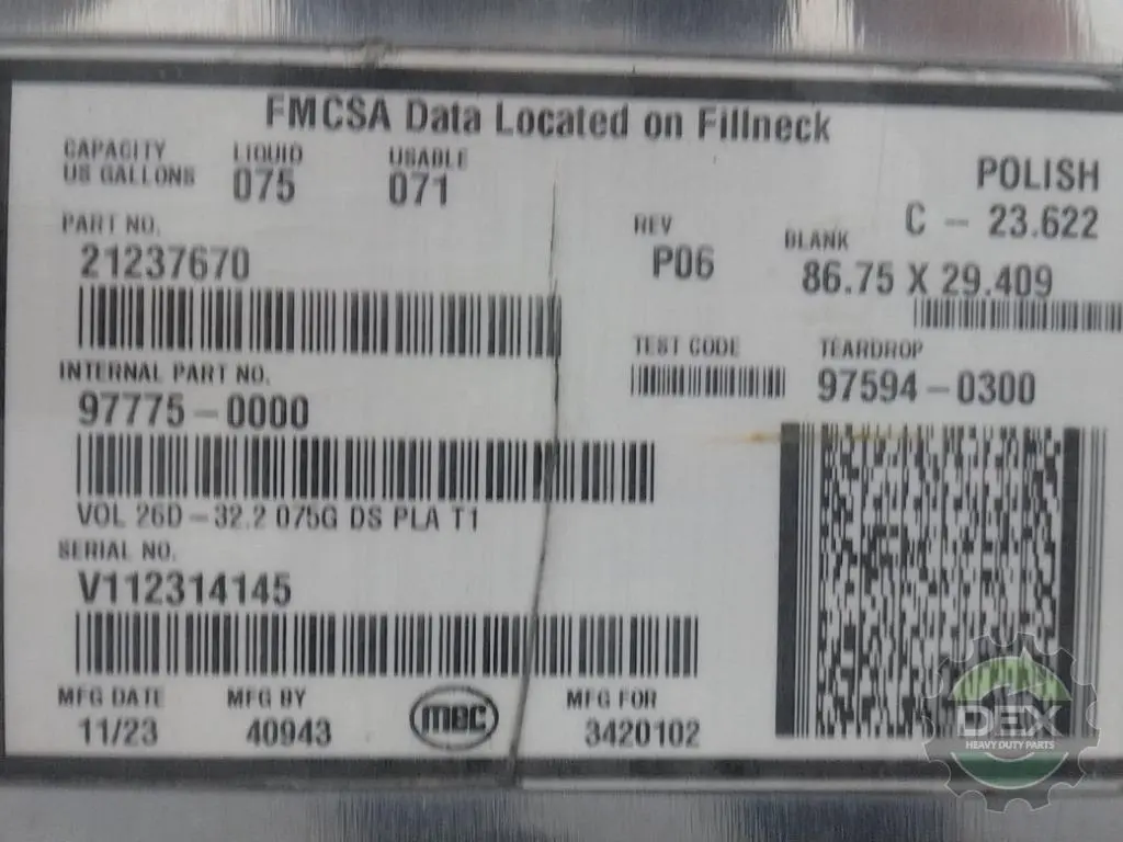 Recycled: Recycled MACK FUEL TANK, 86.75 X 29.409, 75 GAL, D-DIA.660, POLISHED ALUM, 21237670