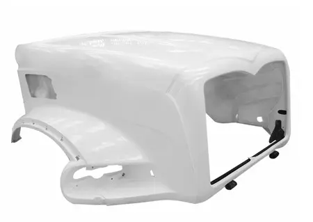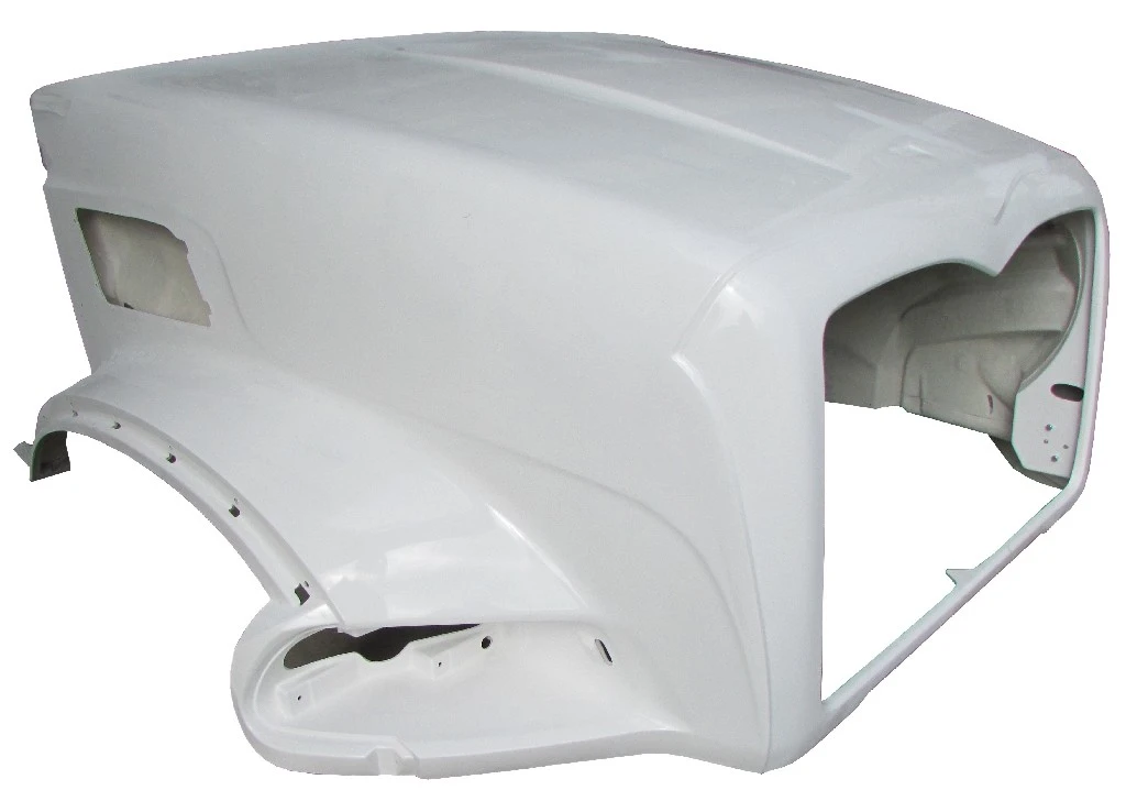 NEW: NEW 2007 AND UP MACK GRANITE CT713 PREMIUM FIBERGLASS HOOD, NOT PAINTED, SBA (SET BACK AXLE) HINGES CROSS BAR, 55" AT CENTERLINE. HOOD ACCEPTS FENDER EXTENSIONS WITH EXTERNAL BOLTS.