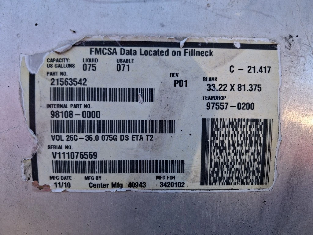 USED: USED Passenger Side Fuel Tank, 75 Gallon Capacity, 33"L x 26"Dia, Center Fill, w/ Straps & Brackets.