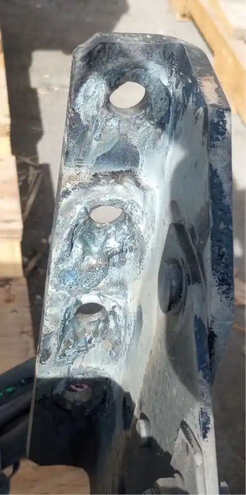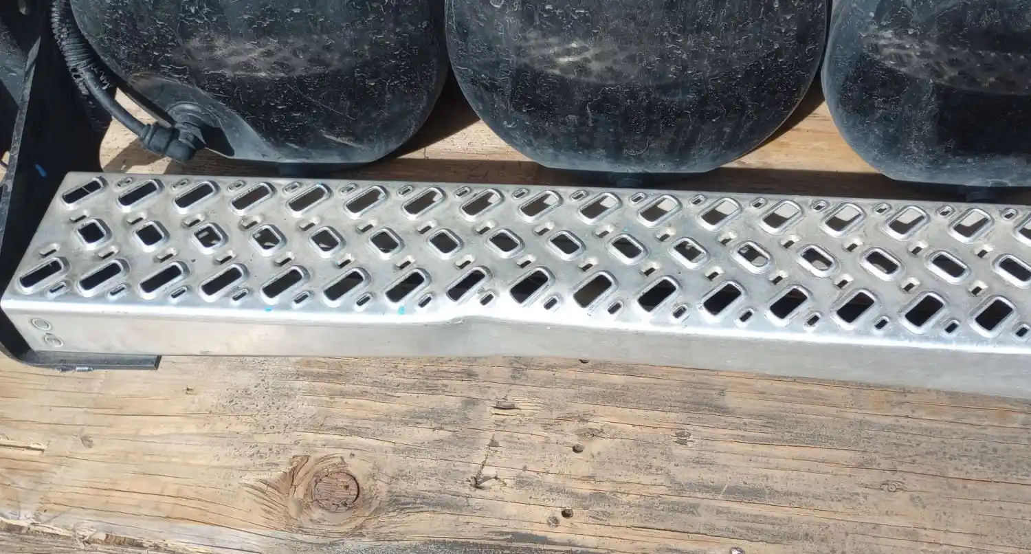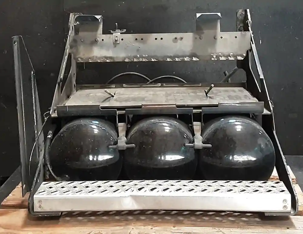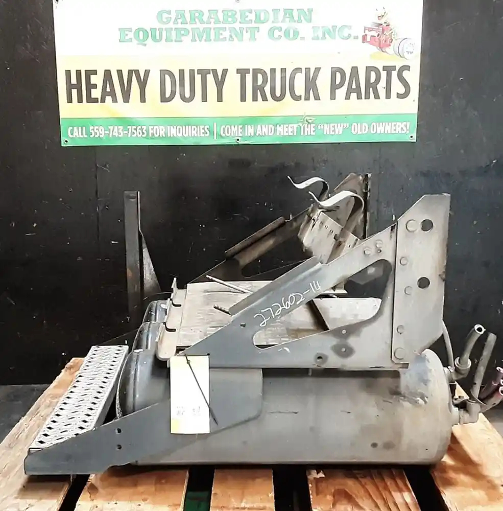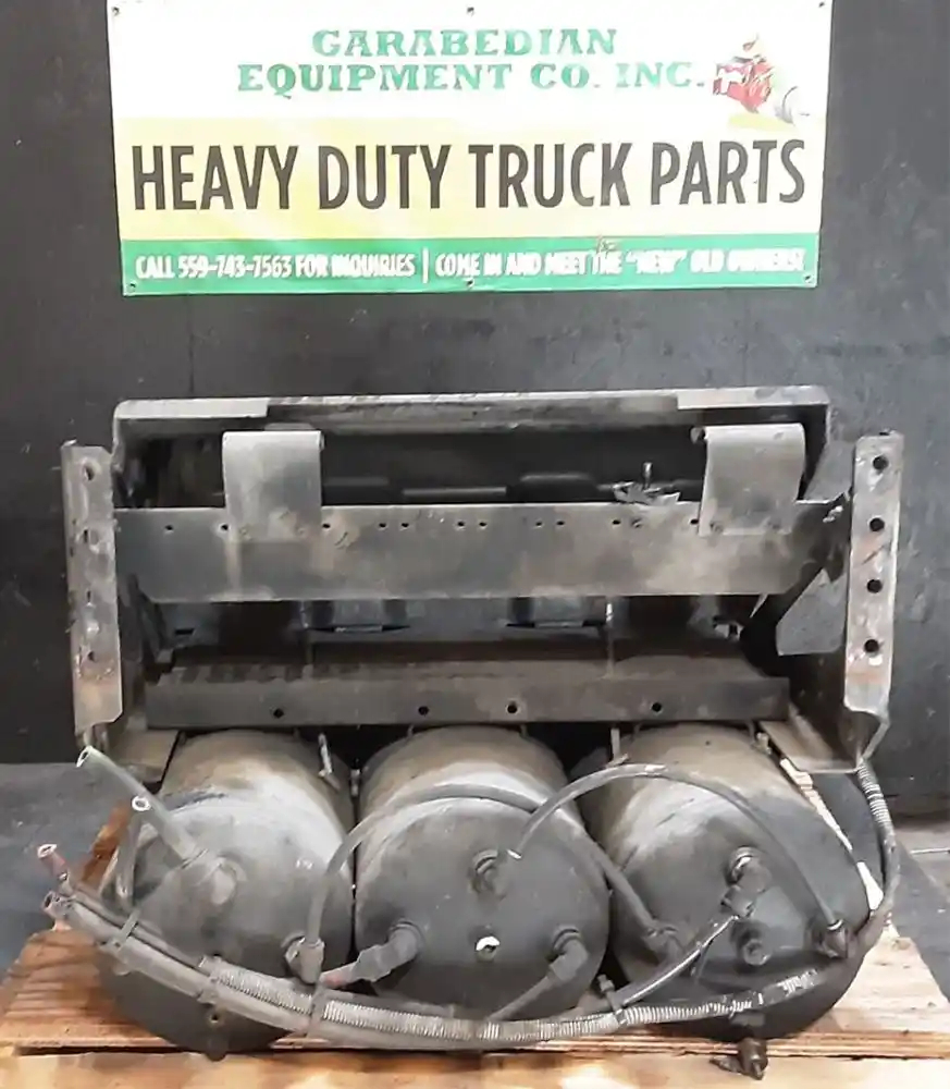Used: Used Driver Side Battery Box, Tray Dimensions: 30"L x 14.5"W x 11"H, 4 Battery Capacity, Includes Lid & 3 Air Tanks. Bottom Step Bent, Mounting Bolt Holes Damaged.