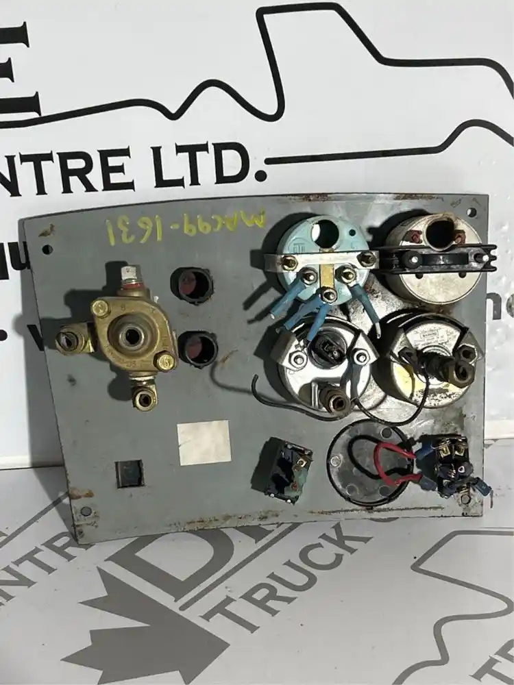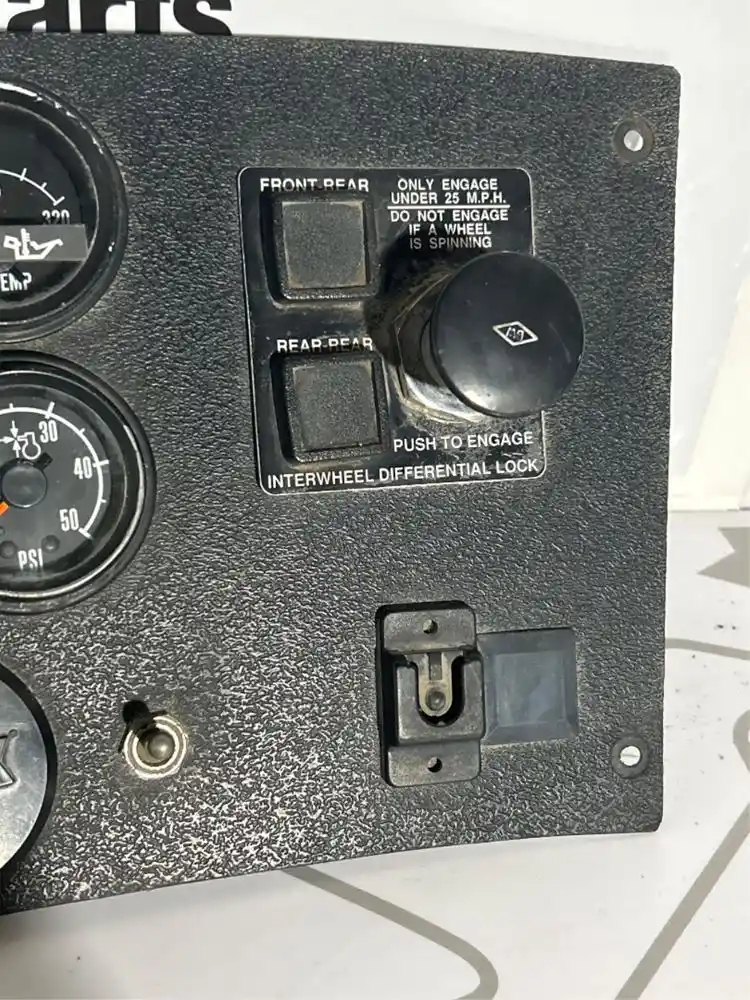 Used: Used Dash panel with control switch for J brake, diff lock, and gauges transmission oil temperature, air cleaner restriction , pyrometer . Dash piece in good used condition four mounting holes .