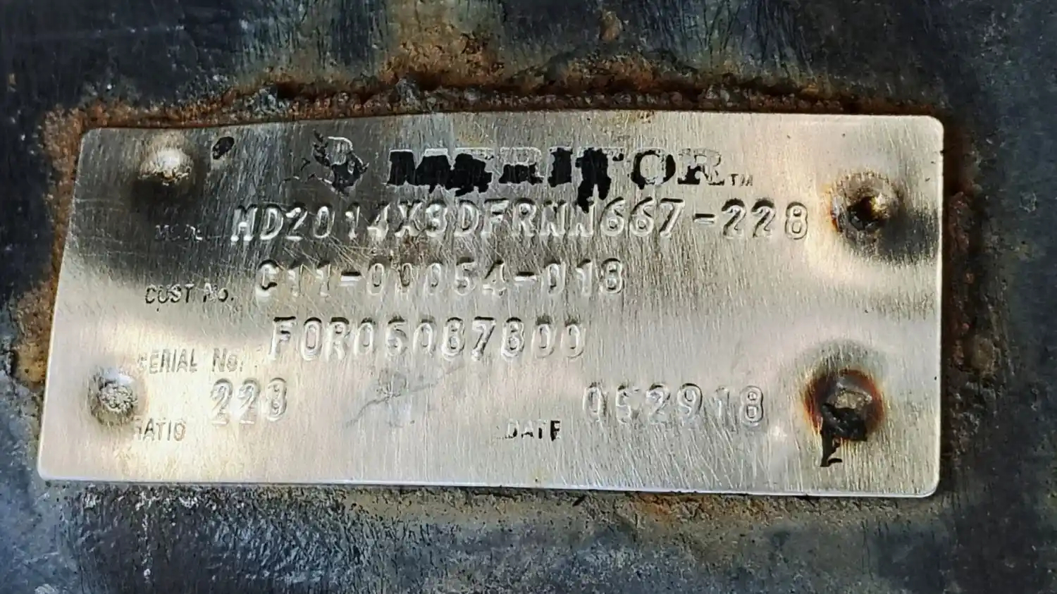 Used: Used Meritor Front Rear Axle Housing, MD2014X, w/ Torque Rod Bracket, 10 Hole Pilot, Air Drum Brakes, ABS, 53.5" Inner Flange To Inner Flange, STD Track. P/N MD2014X3DFRNN667228, C173121M1729, B3121M1729, S/N EGH18570010. Removed From 2019 Freightliner FAS II