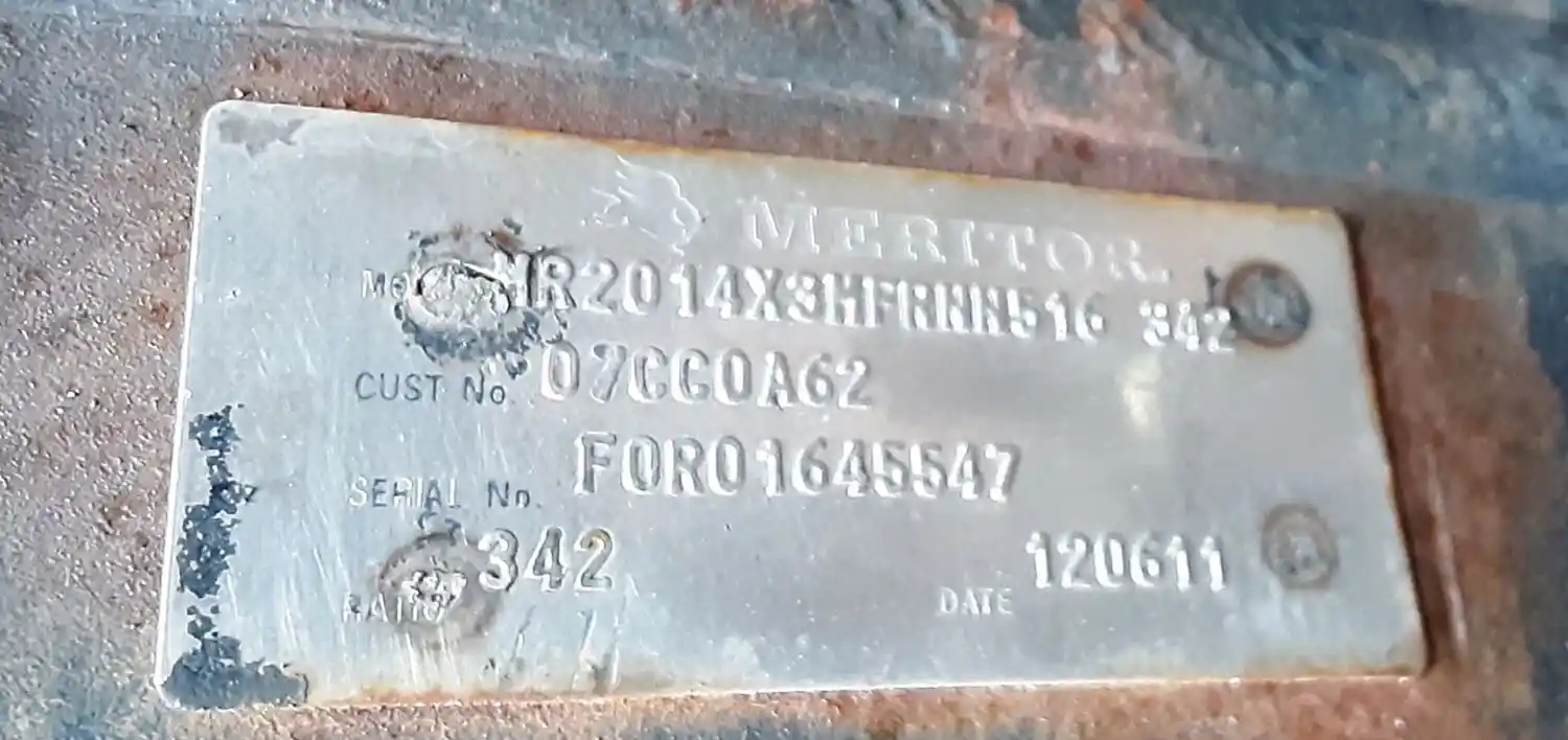 Used: Used Meritor Rear Axle Housing, MR2014X, w/ Torque Rod Bracket, 10 Hole Pilot, Air Drum Brakes, ABS, 16 Hole Flange, 53.5" Inner Flange to Flange, STD Track. P/N E23121L1728. Missing One Axle Shaft.