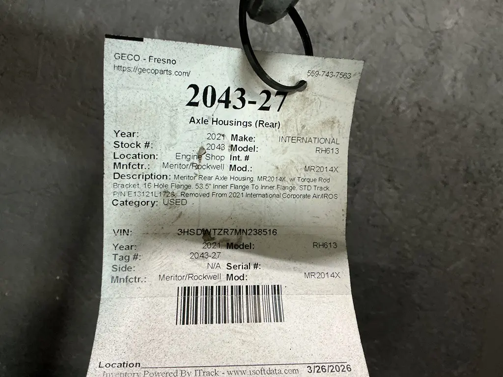 USED: USED Meritor Rear Axle Housing, MR2014X, w/ Torque Rod Bracket, 16 Hole Flange, 53.5" Inner Flange To Inner Flange, STD Track. P/N E13121L1728. Removed From 2021 International Corporate Air/IROS Suspension.