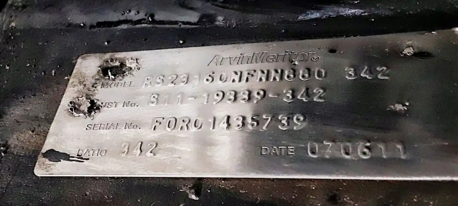 Used: Used Meritor Rear Axle Housing, RS23160, w/ Torque Rod Bracket, 10 Hole Pilot, Air Drum Brakes, ABS, 53.5" Inner Flange To Inner Flange, STD Track. P/N RS23160NFNN880342, C243121Z1872, A3121Z1872S, S/N F0R01435739. Removed From 2012 Freightliner FAS II Airl