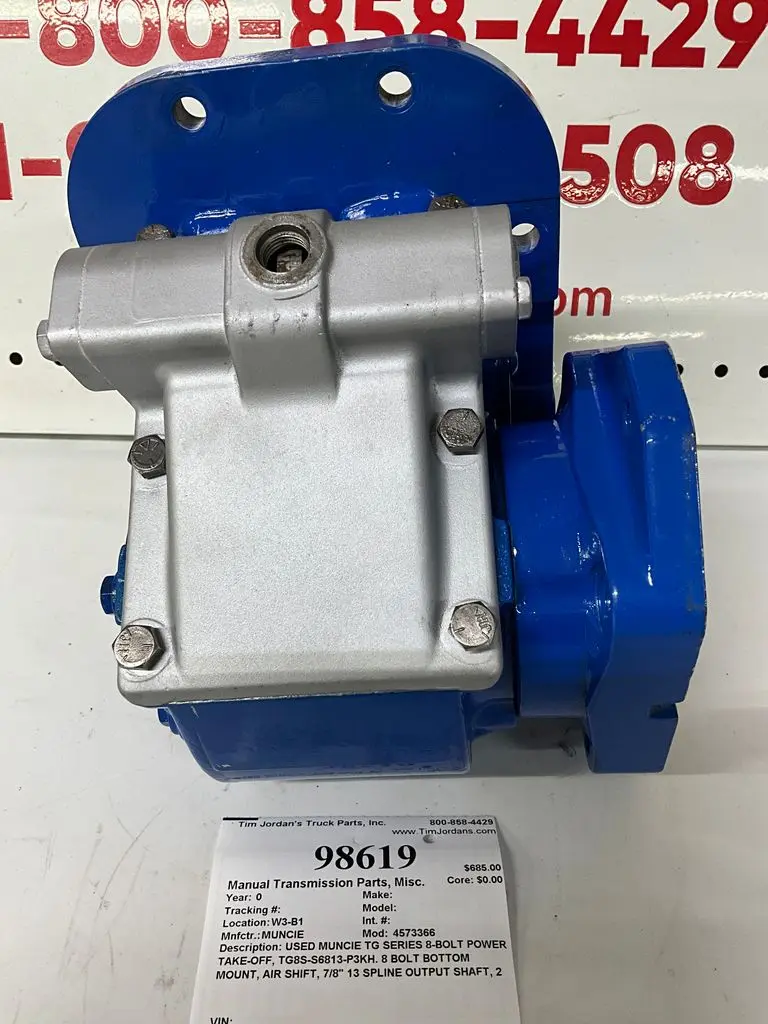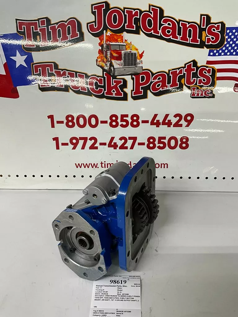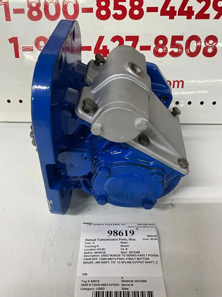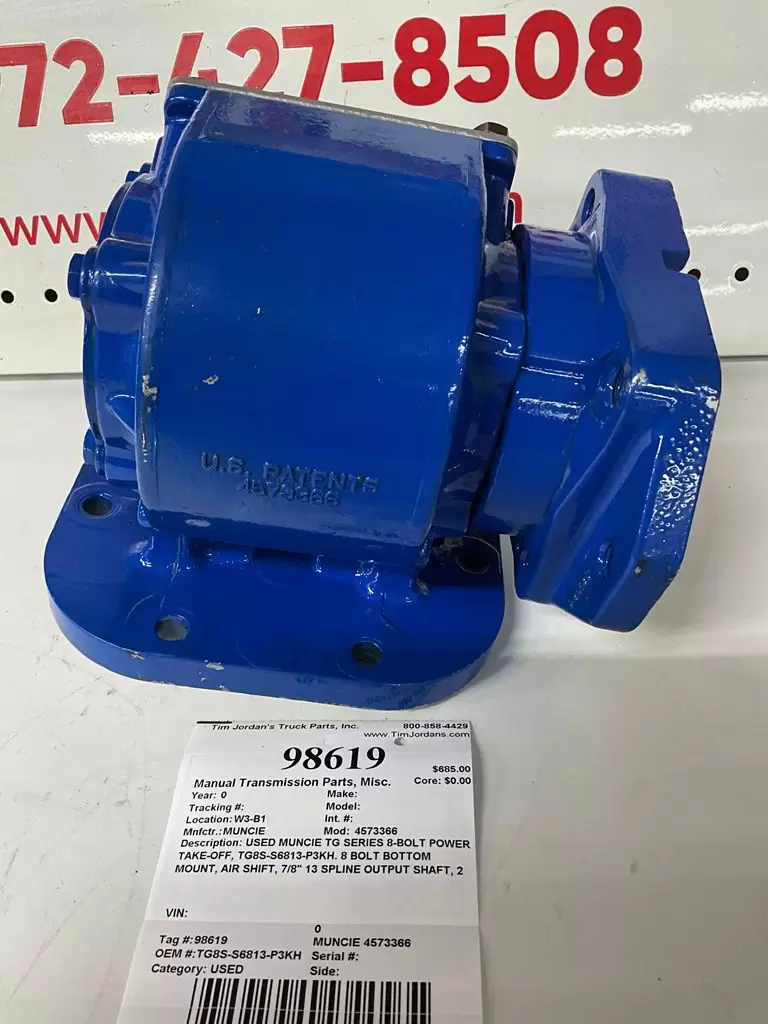 USED: USED USED MUNCIE TG SERIES 8-BOLT POWER TAKE-OFF, TG8S-S6813-P3KH. 8 BOLT BOTTOM MOUNT, AIR SHIFT, 7/8" 13 SPLINE OUTPUT SHAFT, 2 BOLT OR 4 BOLT PUMP MOUNT, SPEED RATIO= 1.285:1