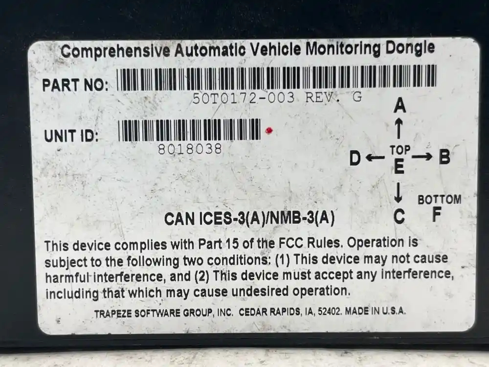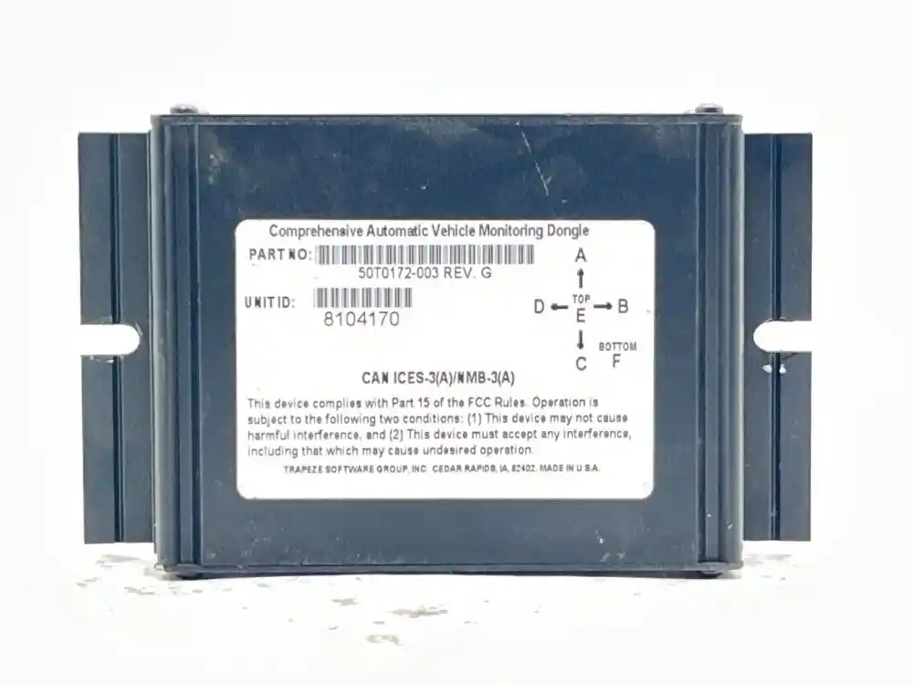 (Used) New Flyer DE40 LF, COMPREHENSIVE AUTOMATIC VEHICLE MONITORING DONGLE- Make: TRAPEZE, Model: 50T0172-003 REV G, 1 Rectangular Plug with 16 Pins, Reference images for condition, For more information about this item, give us a call. We ship worldwide! (CRG HEAVY TRUCK PARTS) 929 W PULASKI HWY ELKTON, MD 21921