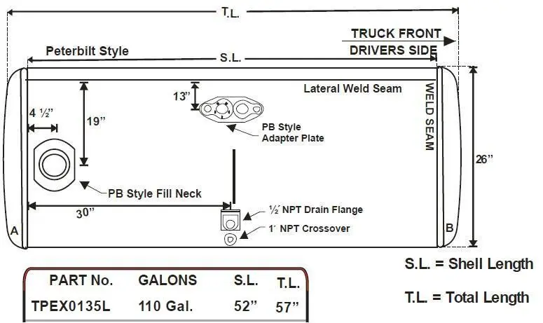 NEW - TANK ONLY: NEW - TANK ONLY 2006 AND OLDER PETERBILT 125 GAL. FUEL TANK 26" X 57" PASSENGER SIDE REAR FILL