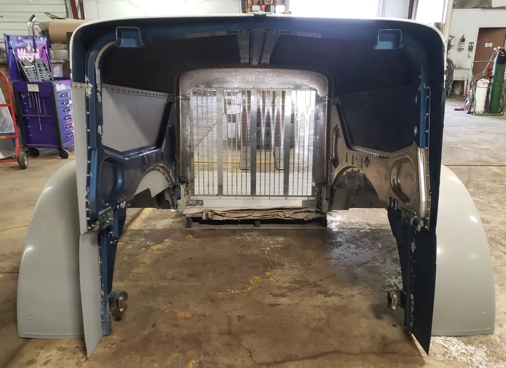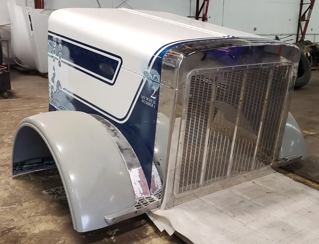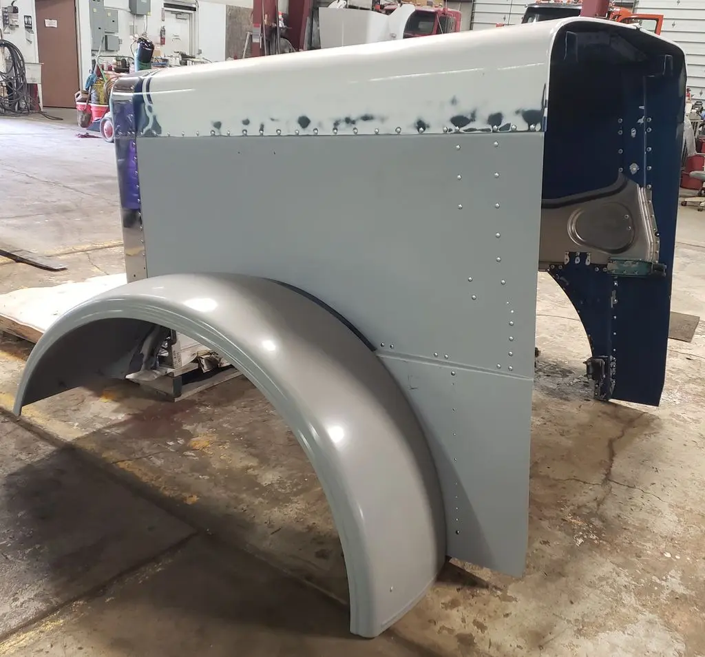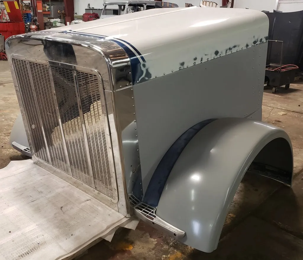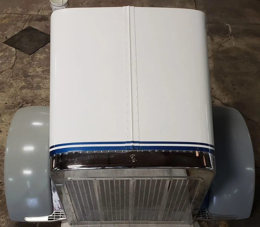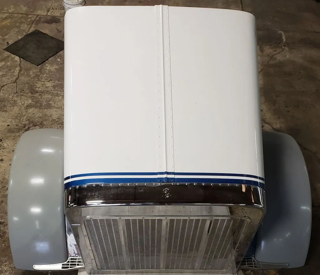 Peterbilt OEM aluminum long hood pulled from a 1995 Peterbilt 379. Hood is freshly rebuilt with brand new aluminum fenders, new inner structure, and new passenger side panel (see component P/N in pictures). Grill was also freshly replaced. Has one remaining dime-sized ding on rear driver panel as pictured. Otherwise ready for primer and paint.