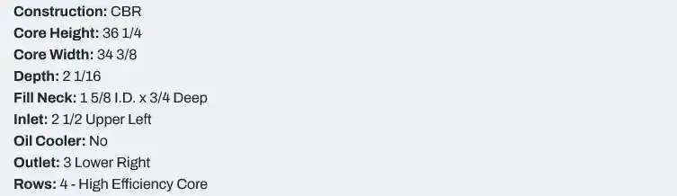 New complete radiator, heavy duty 4 row. Includes top and bottom tanks. 36 1/4 x 34 3/8 x 2 1/16 (4 Row) Can be drop shipped anywhere in U.S.A. available Fits: Peterbilt 357, 375, 378, 379 Check for fan clearance. 1998 or older may need to re-use original side channels Lower connection can be reversed Ship by truck only