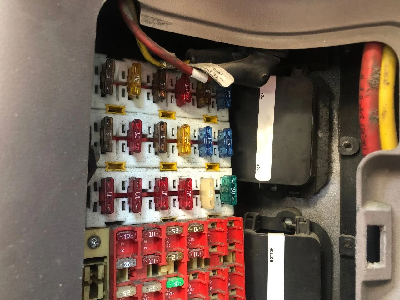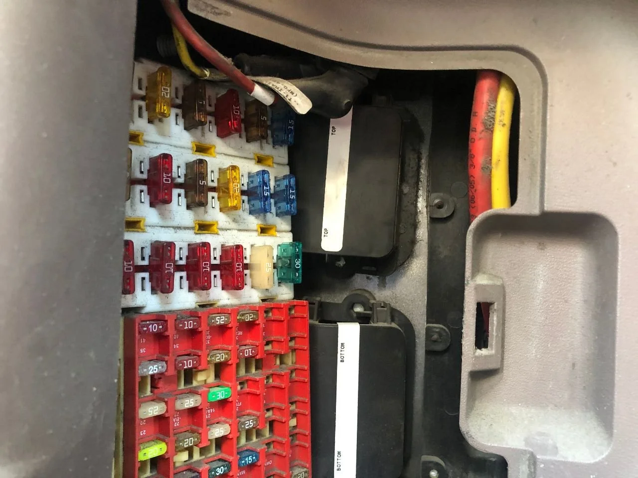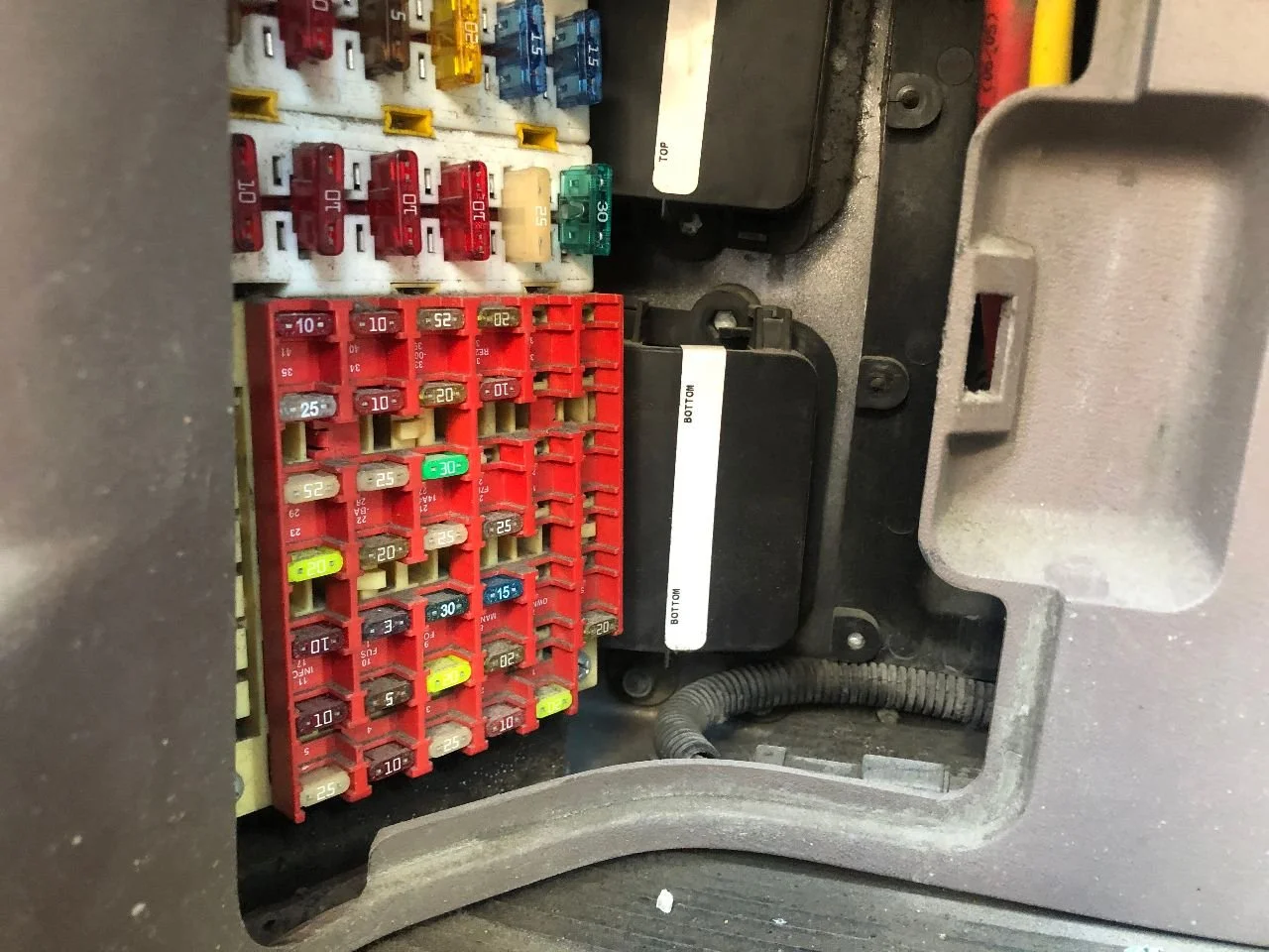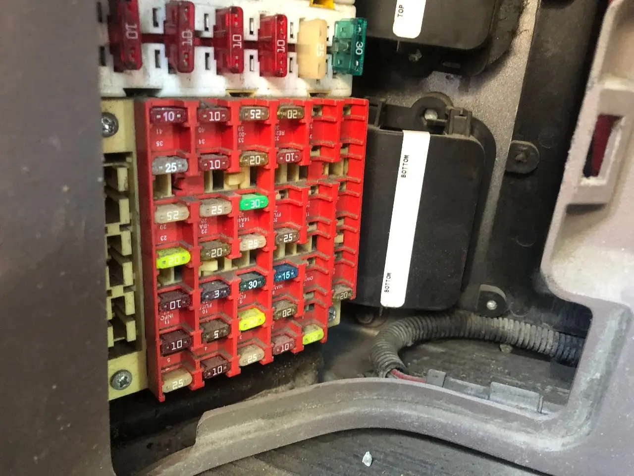 USED: USED FUSE BOX, LESS WIRES, LESS COVER, MOUNTS IN FIREWALL BELOW STEERING COLUMN