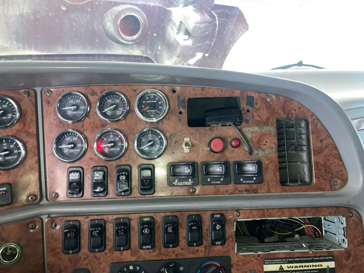 USED: USED FRONT AXLE TEMP, TRANS TEMP, LOAD SCALE, REAR AXLE TEMP, AIR FILTER & BRAKE PSI GAUGES. CRUISE X2, ENGINE BRAKE, SELECT UP/DOWN, INTER AXLE, FIFTH WHEEL & SUSPENSION SWITCHES