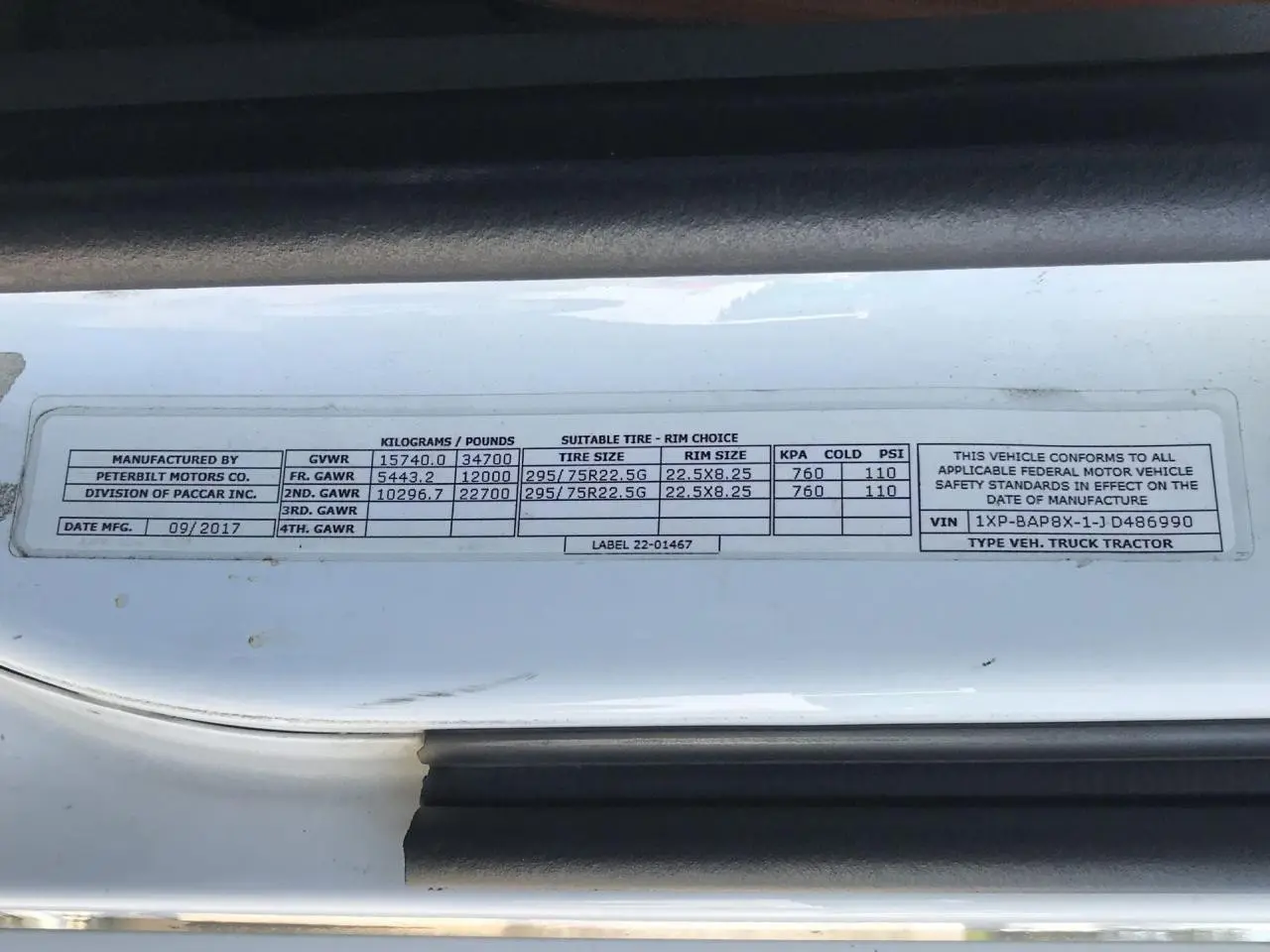 VIN #:1XPBAP8X1JD486990