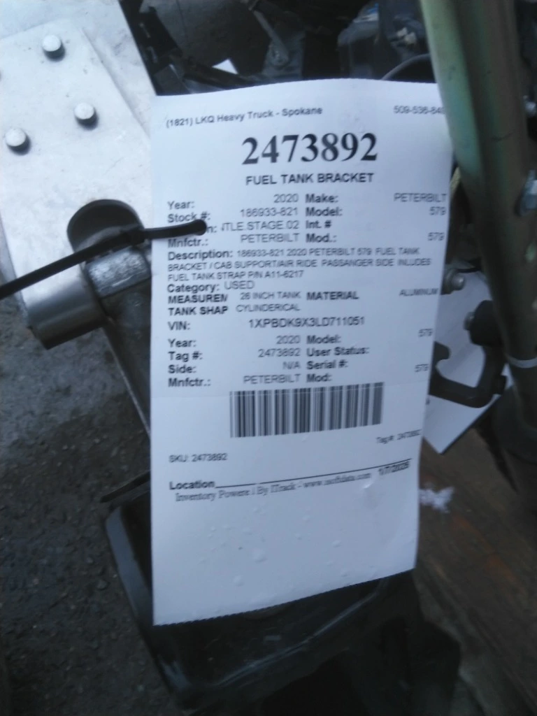 USED: USED 186933-821 2020 PETERBILT 579 FUEL TANK BRACKET / CAB SUPPORT/AIR RIDE PASSANGER SIDE INLUDES FUEL TANK STRAP P/N A11-6217