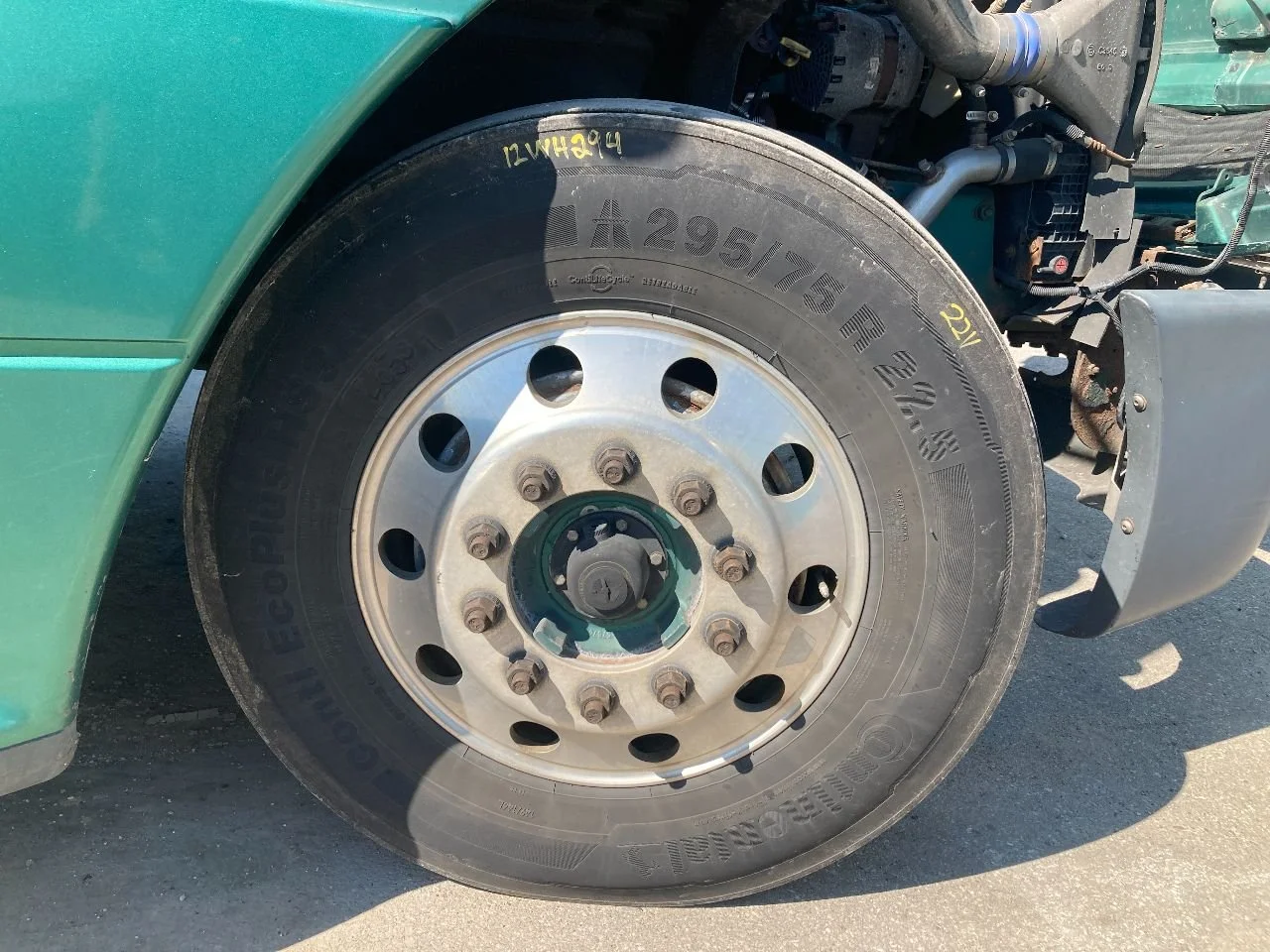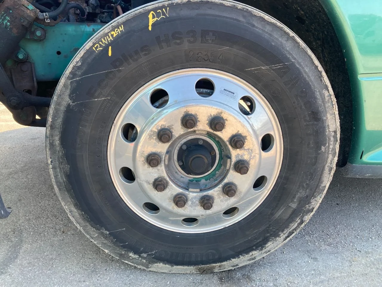 USED: USED SET OF 2 CONTINENTAL ECOPLUS HS3 STEER TIRES, MOUNTED ON 22.5" ALUMINUM WHEELS. 2.5" CLASSIC ROUND HOLE